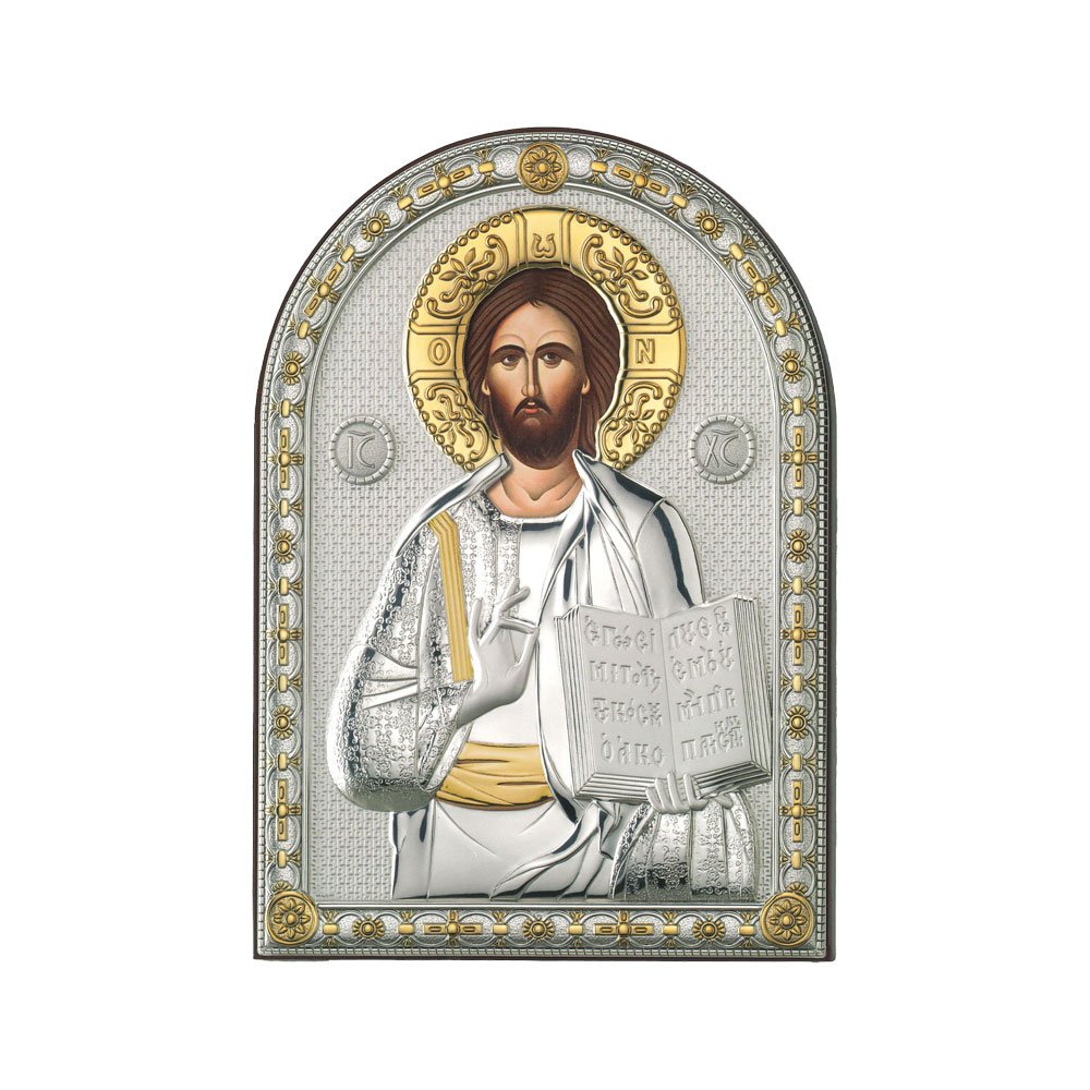 ICONA RAFFIGURANTE IL CRISTO BENEDICENTE IN ARGENTO PVD CON COLORE SU LASTRA RETRO LEGNO DA APPOGGIO E DA PARETE