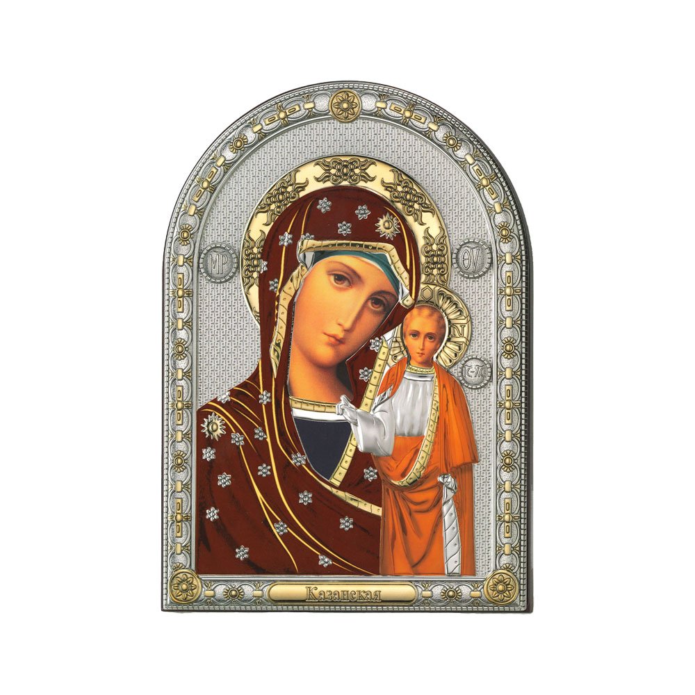 ICONA RAFFIGURANTE LA MADONNA DI KAZAN IN ARGENTO PVD CON COLORE SU LASTRA RETRO LEGNO DA APPOGGIO E DA PARETE