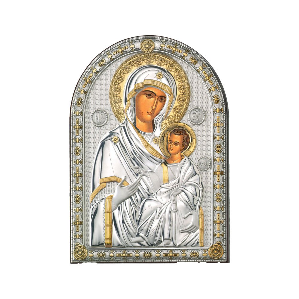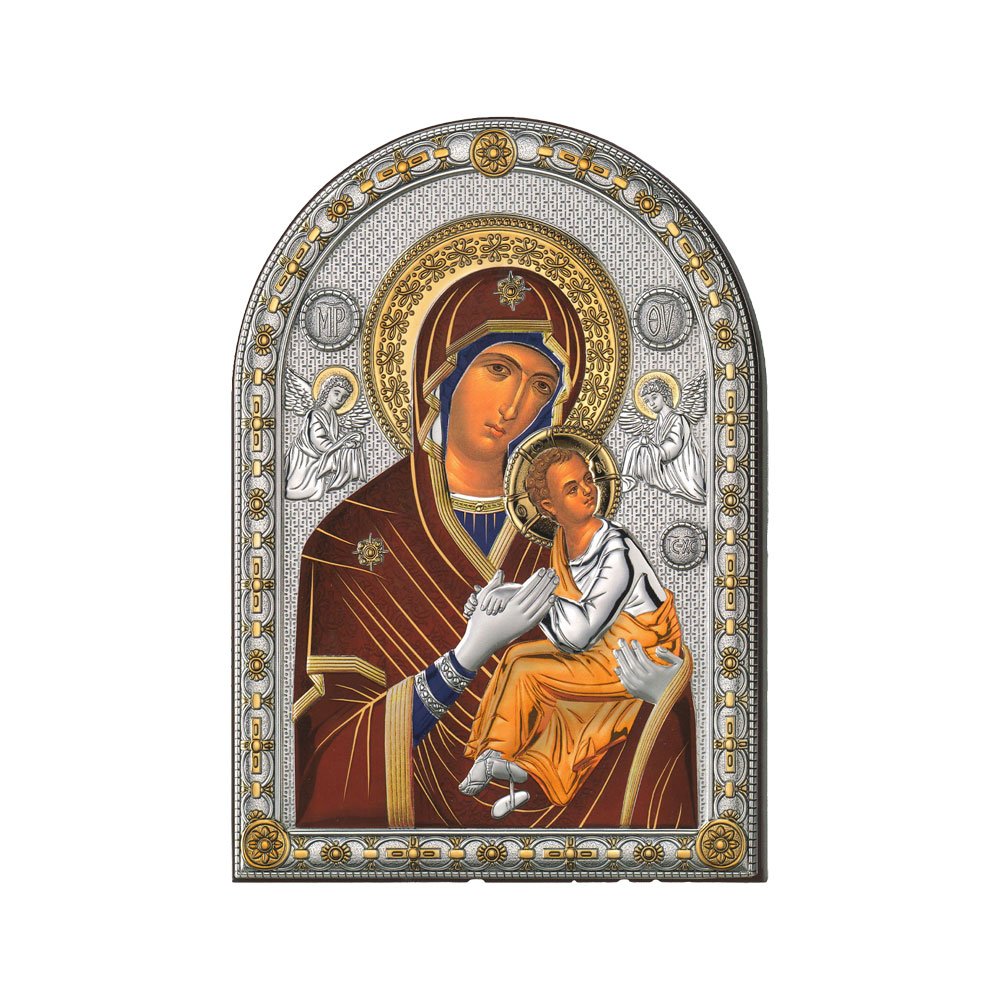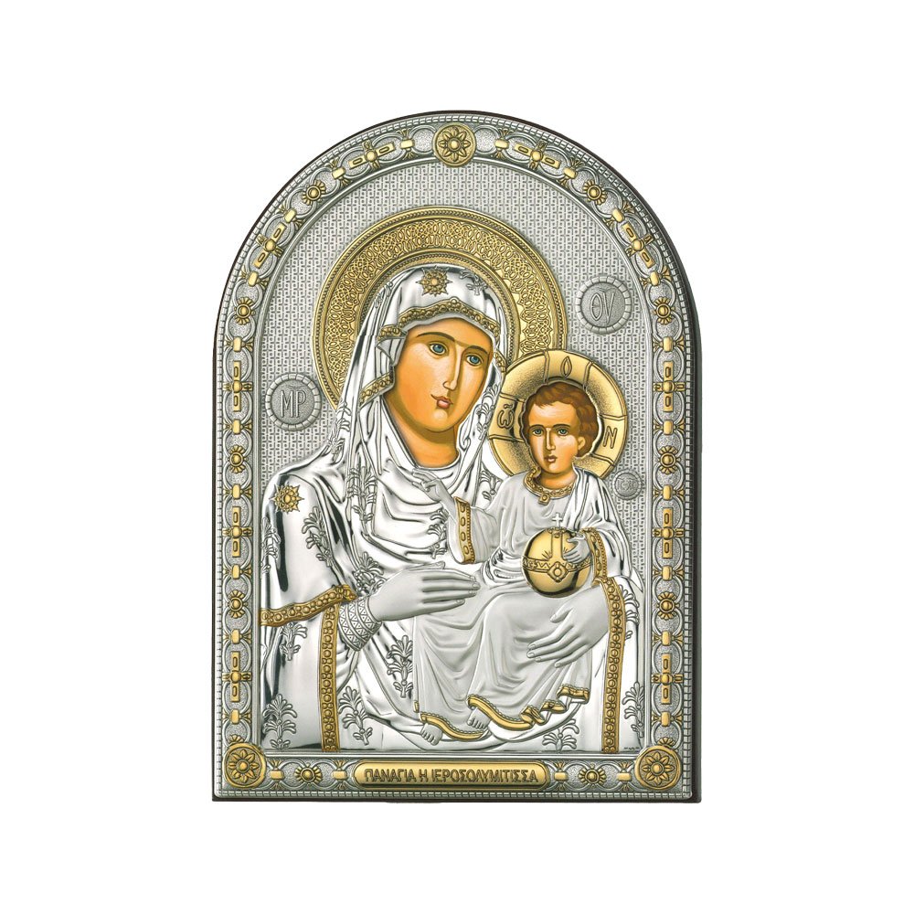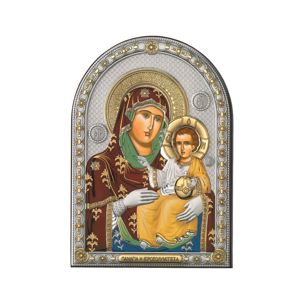 ICONA RAFFIGURANTE LA MADONNA DI PANAGIA IEROSOLYMITISSA IN ARGENTO PVD CON COLORE SU LASTRA RETRO LEGNO DA APPOGGIO E DA PARETE