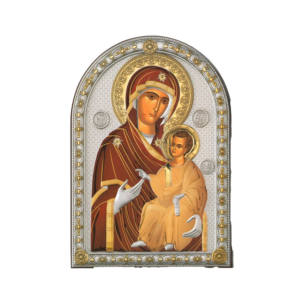 ICONA RAFFIGURANTE LA MADONNA DI ODIGITRIA IN ARGENTO PVD CON COLORE SU LASTRA RETRO LEGNO DA APPOGGIO E DA PARETE
