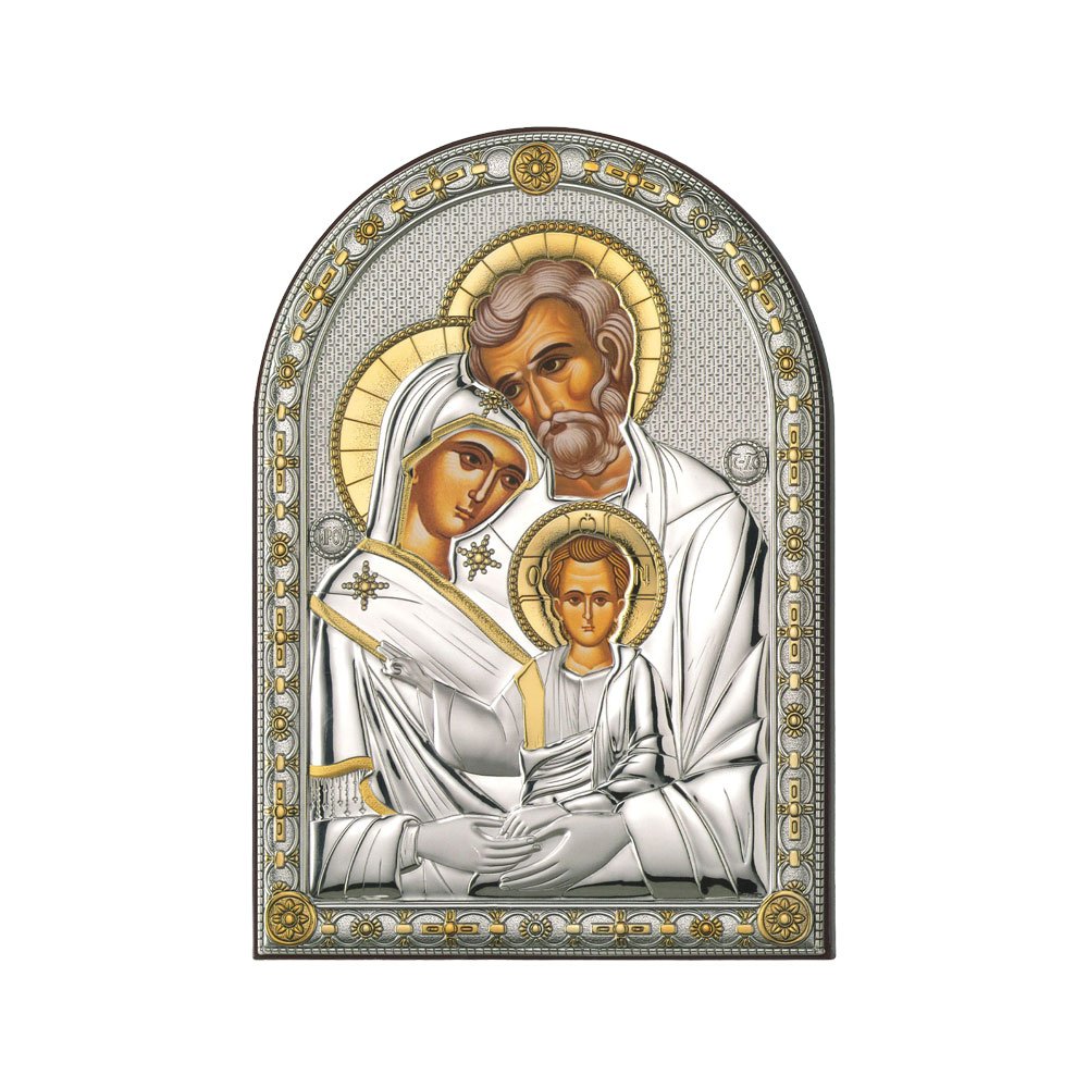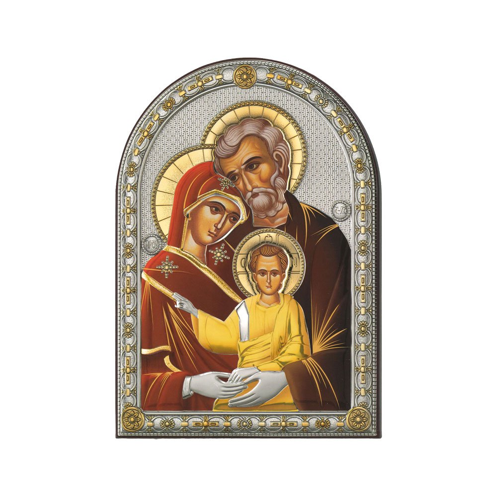 ICONA RAFFIGURANTE SACRA FAMIGLIA IN ARGENTO PVD CON COLORE SU LASTRA RETRO LEGNO DA APPOGGIO E DA PARETE