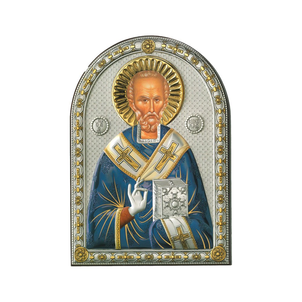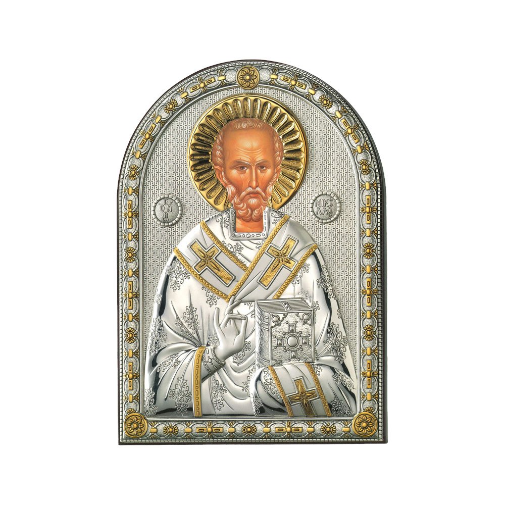 ICONA RAFFIGURANTE SAN NICOLA IN ARGENTO PVD CON COLORE SU LASTRA RETRO LEGNO DA APPOGGIO E DA PARETE