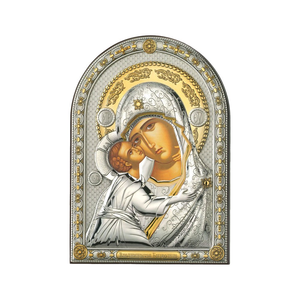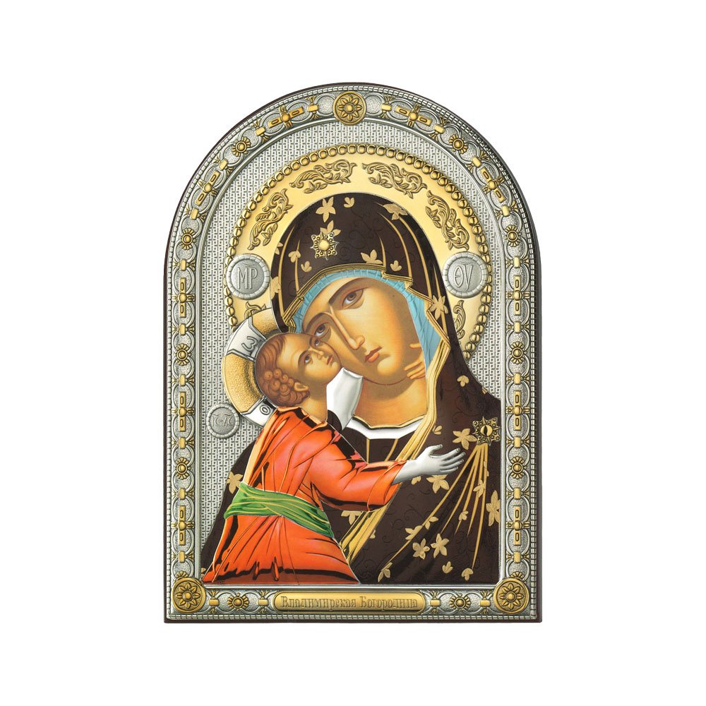 ICONA RAFFIGURANTE MADONNA DI VLADIMIR IN ARGENTO PVD CON COLORE SU LASTRA RETRO LEGNO DA APPOGGIO E DA PARETE
