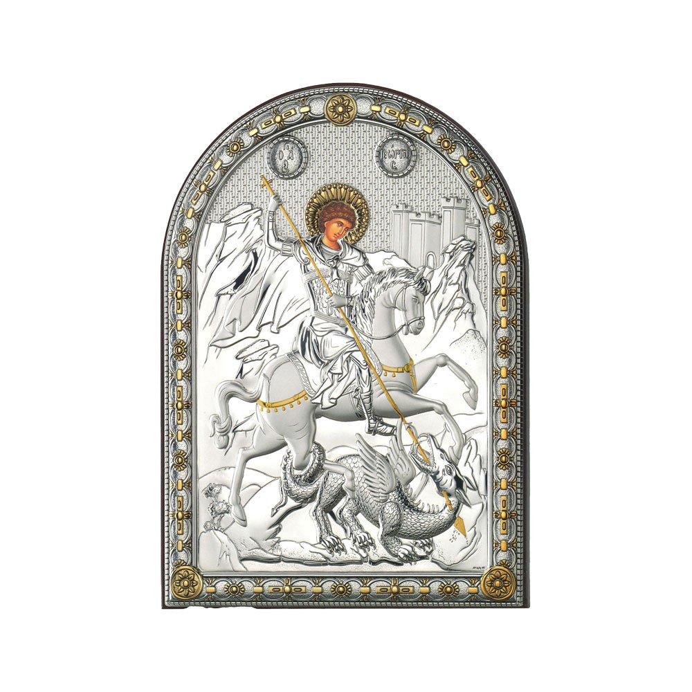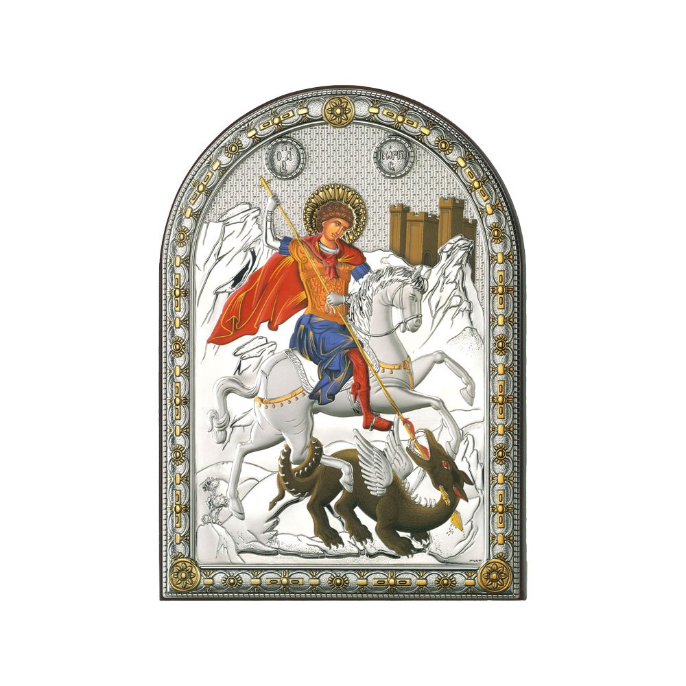 ICONA RAFFIGURANTE SAN GIORGIO IN ARGENTO PVD CON COLORE SU LASTRA RETRO LEGNO DA APPOGGIO E DA PARETE