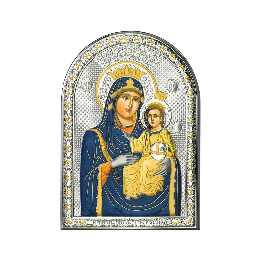 ICONA RAFFIGURANTE MADONNA DI BETLEMME IN ARGENTO PVD CON COLORE SU LASTRA RETRO LEGNO DA APPOGGIO E DA PARETE