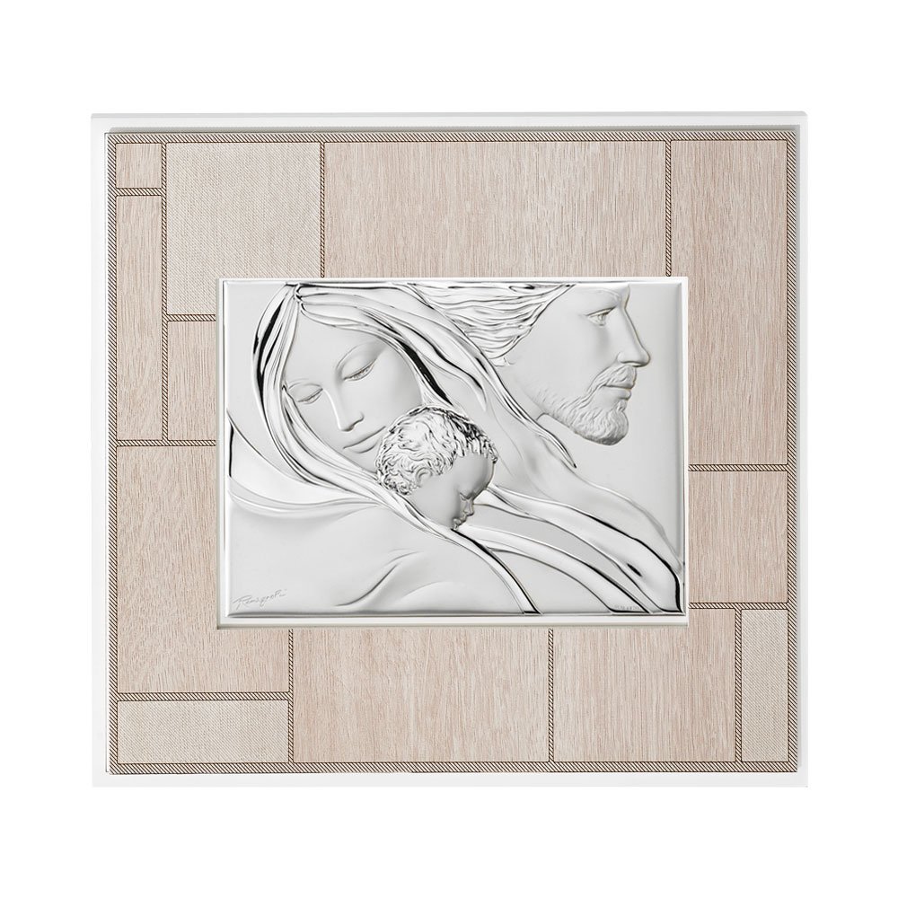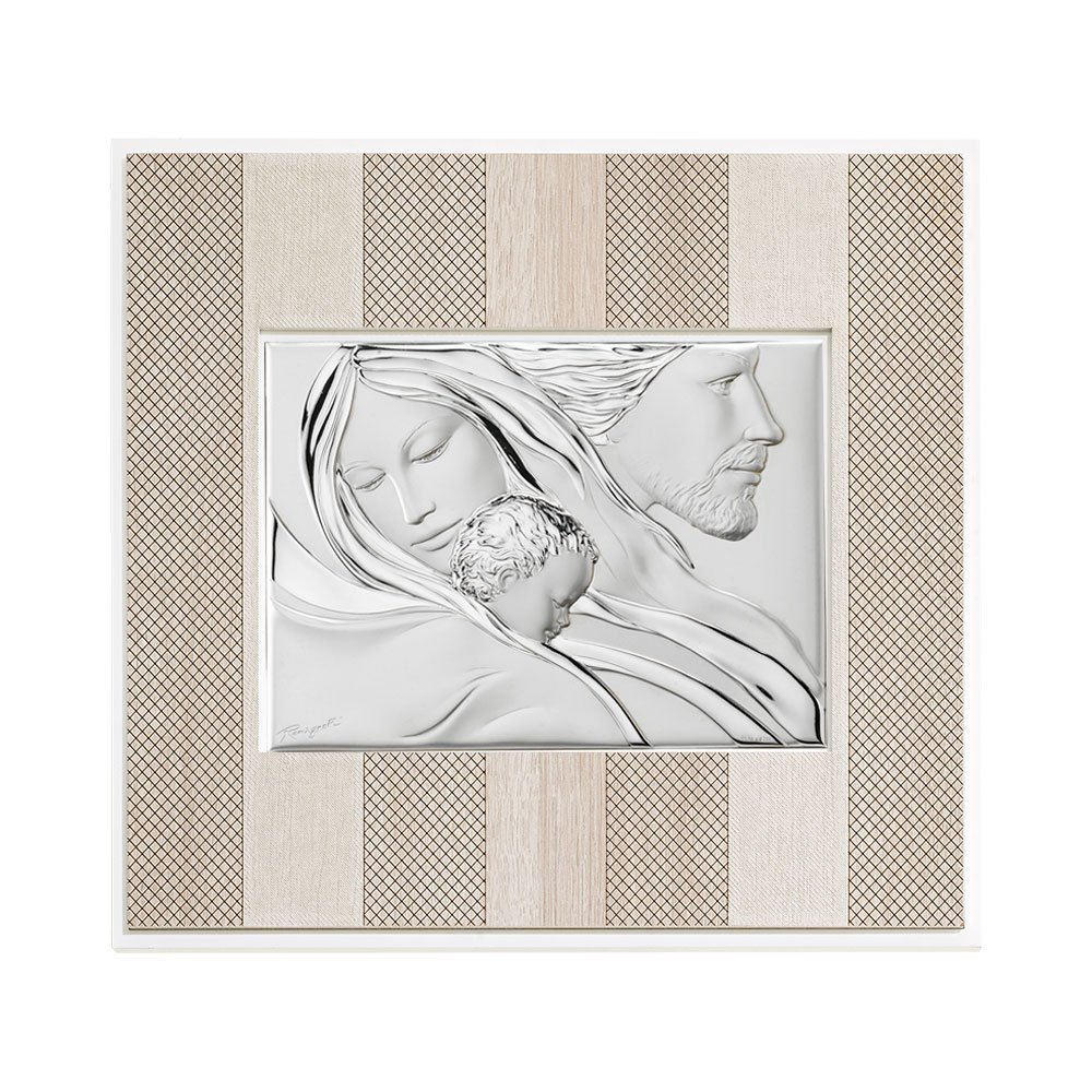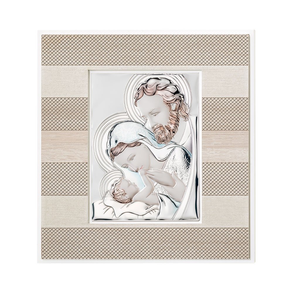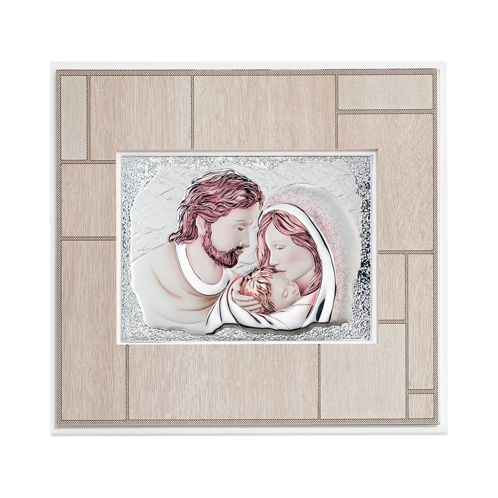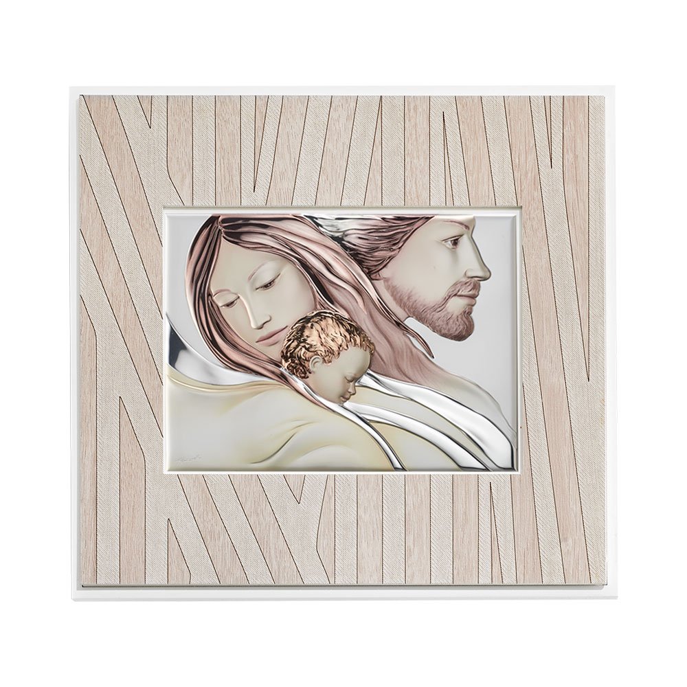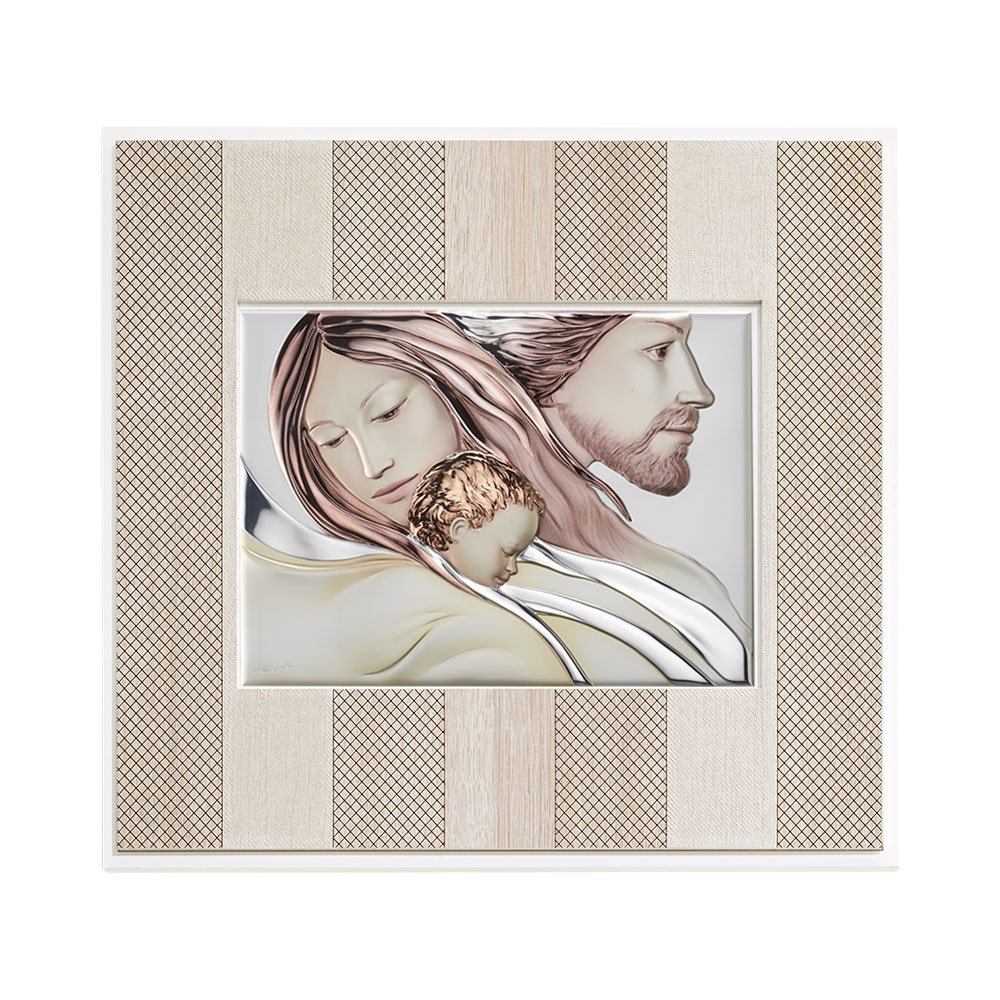 QUADRO MODERNO SACRA FAMIGLIA COLORATI IN ARGENTO PVD DA APPOGGIO E DA PARETE