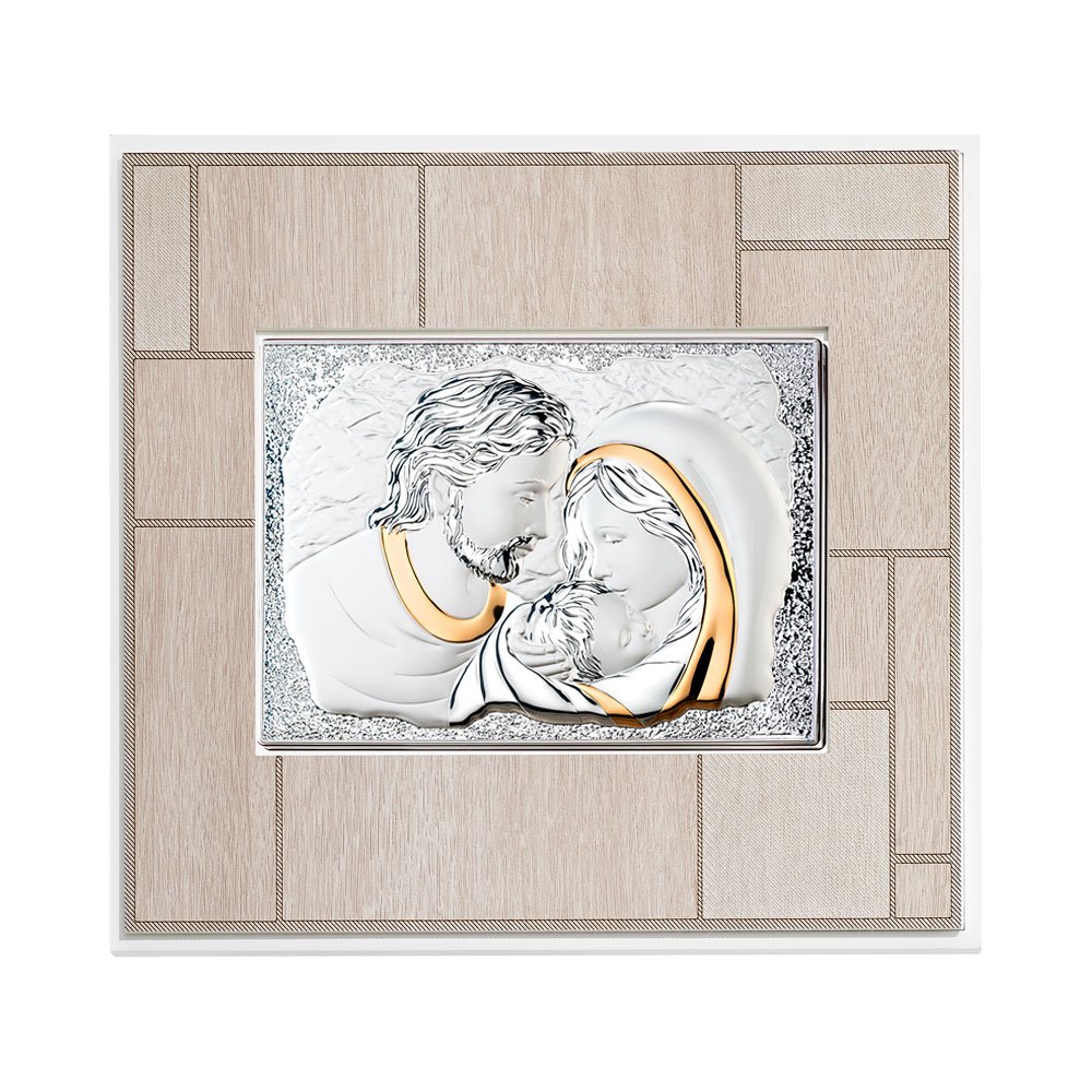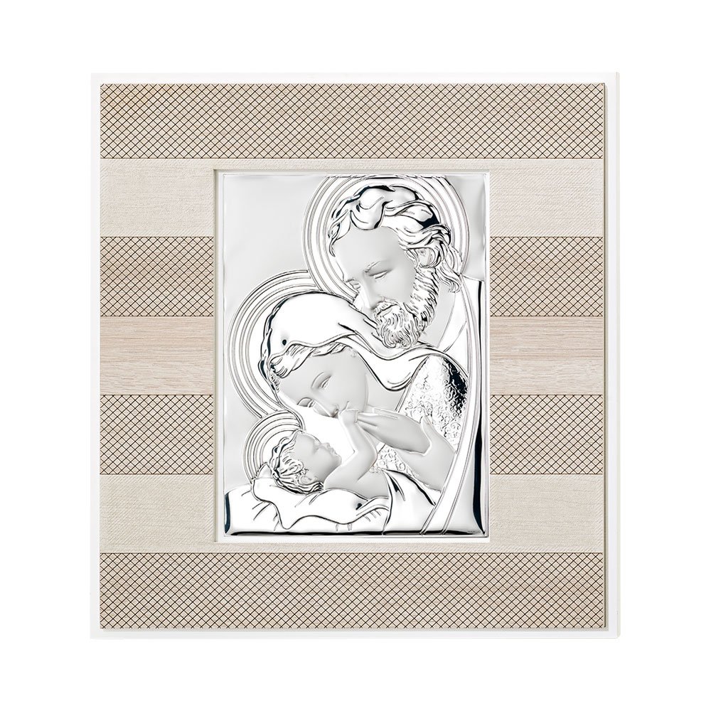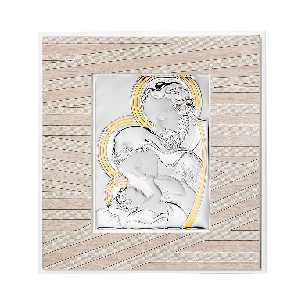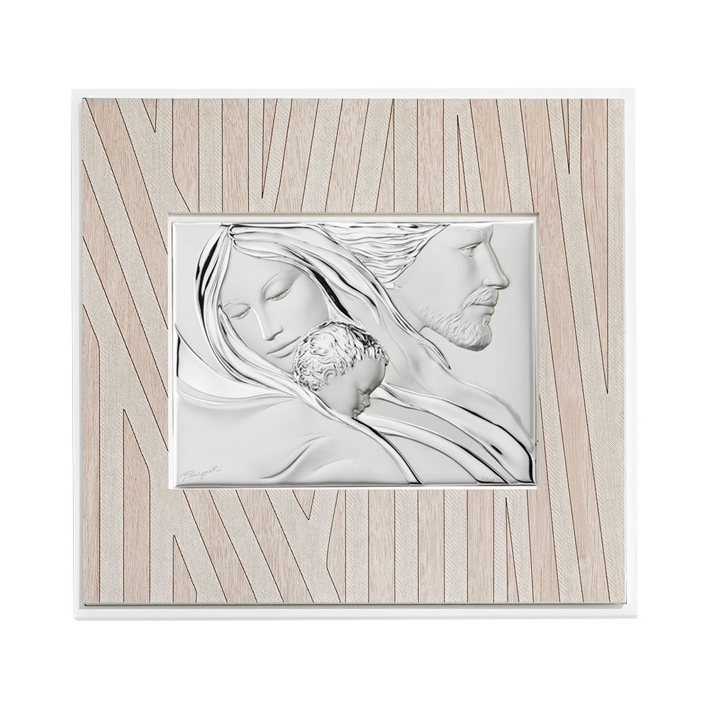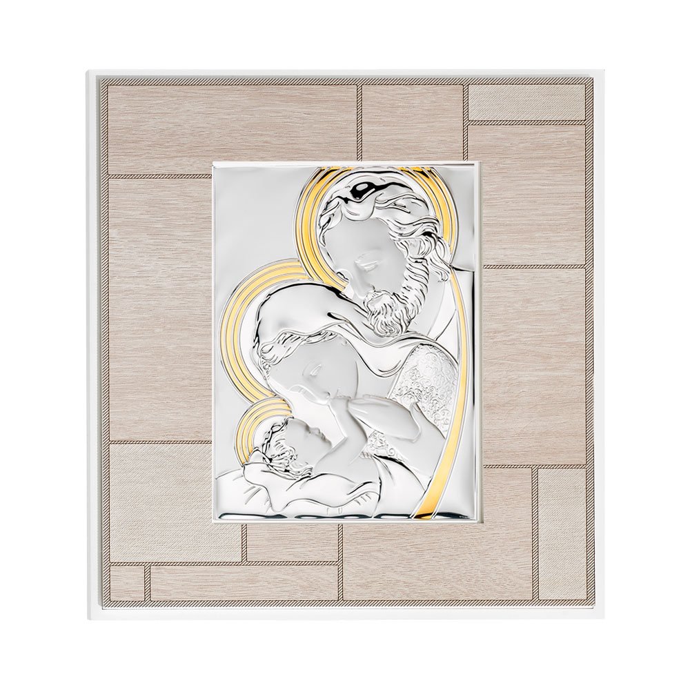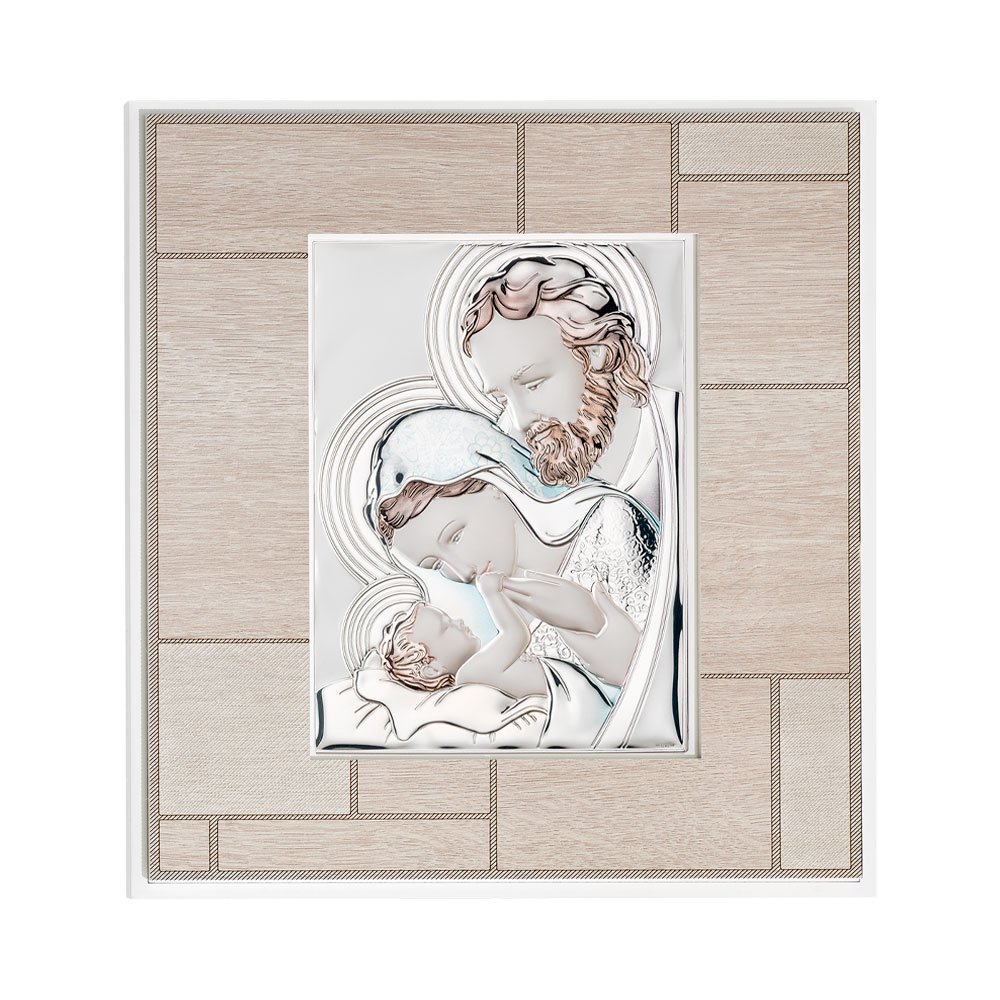 QUADRO MODERNO SACRA FAMIGLIA COLORATI IN ARGENTO PVD DA APPOGGIO E DA PARETE
