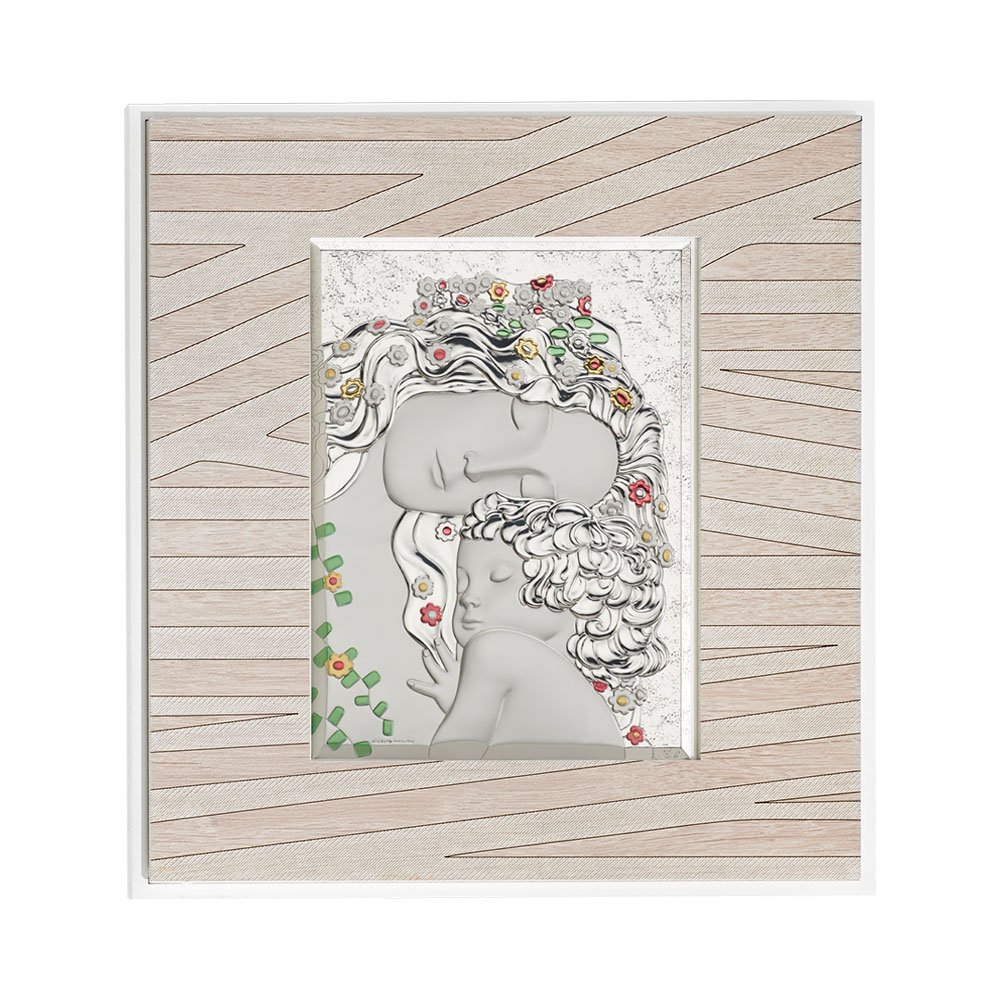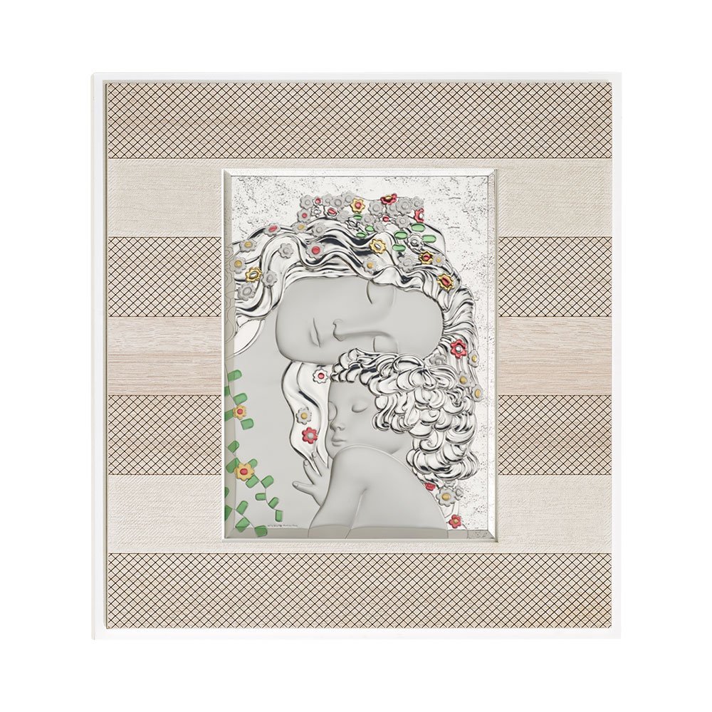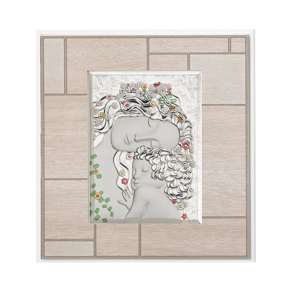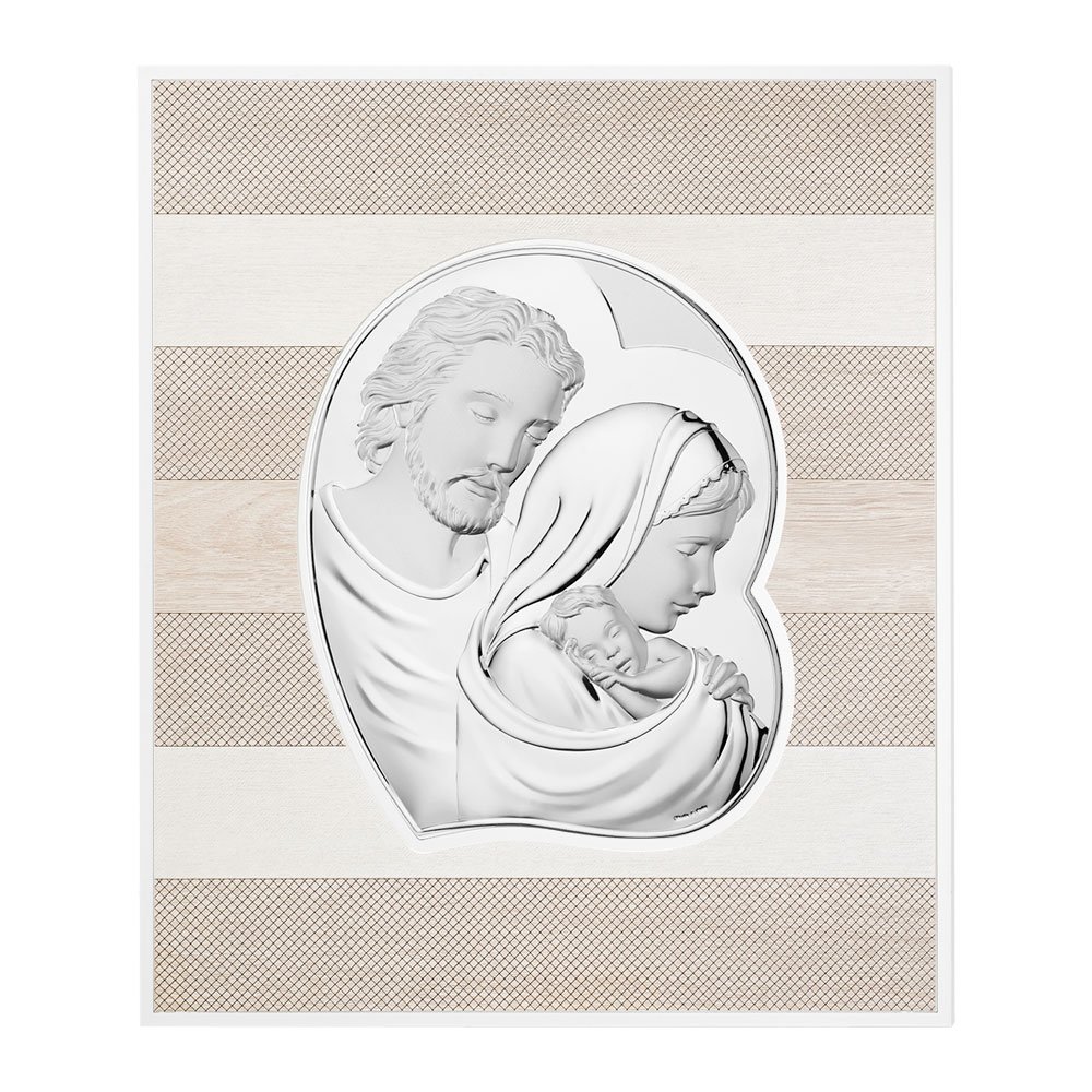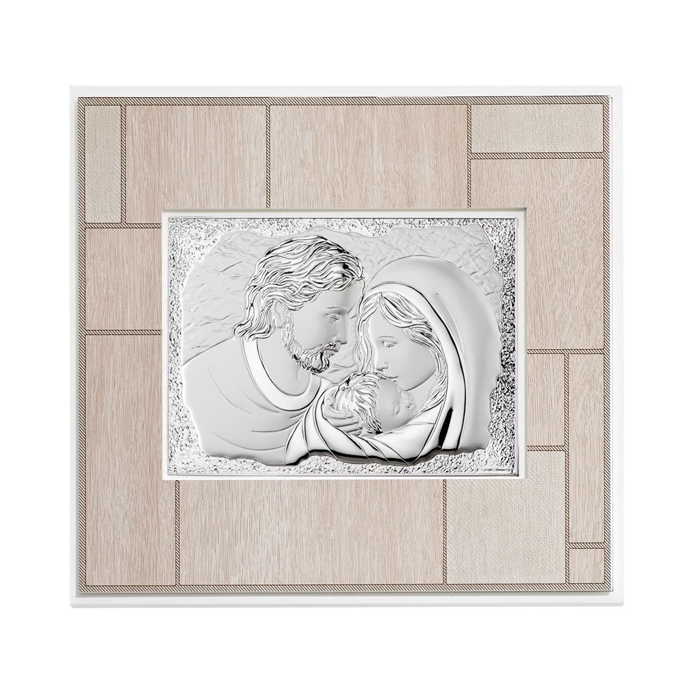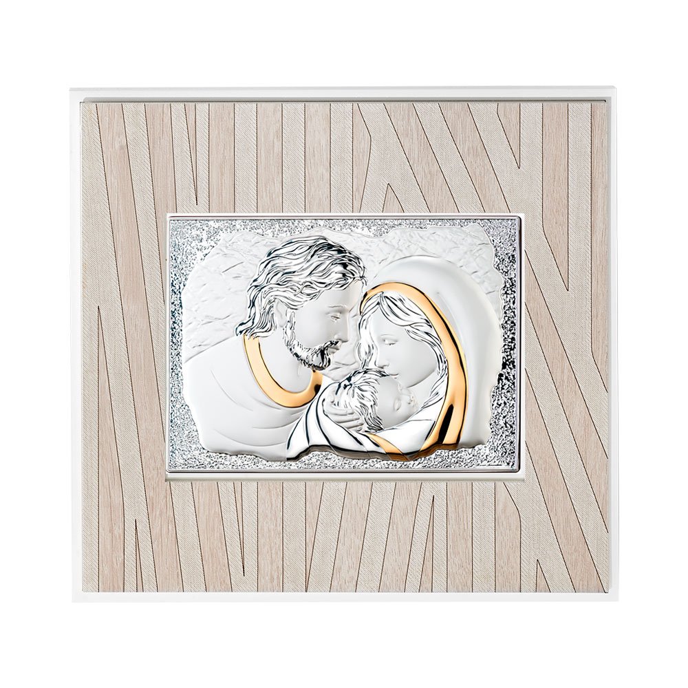 QUADRO MODERNO SACRA FAMIGLIA COLORATI IN ARGENTO PVD DA APPOGGIO E DA PARETE