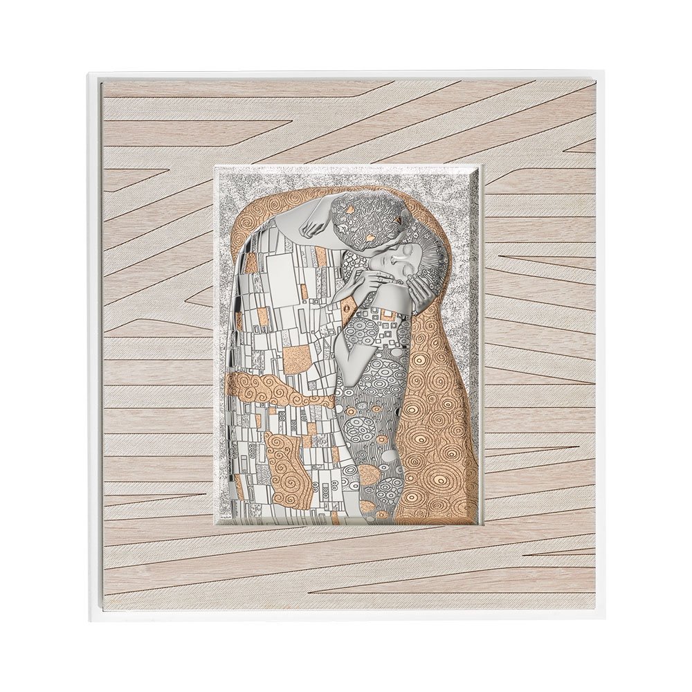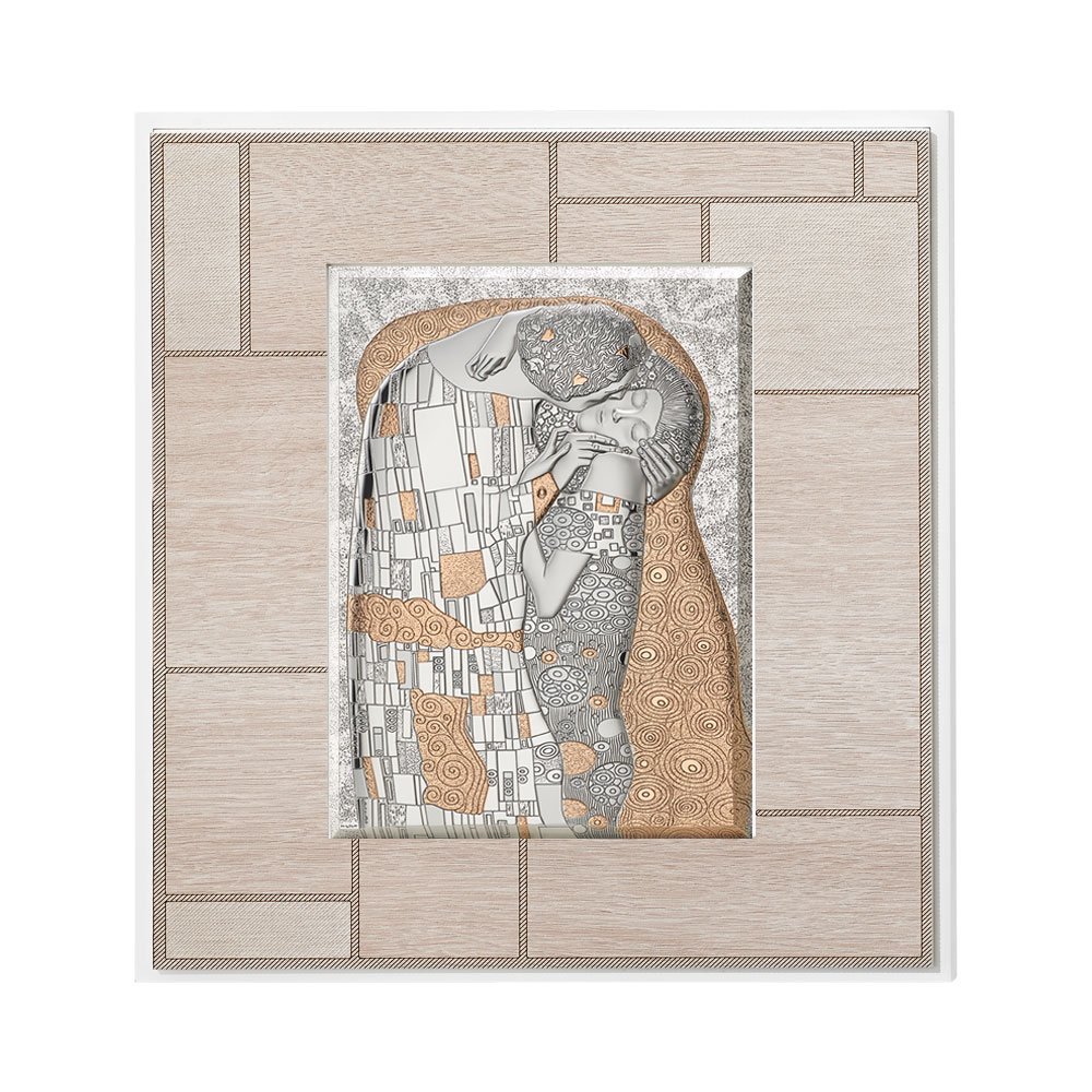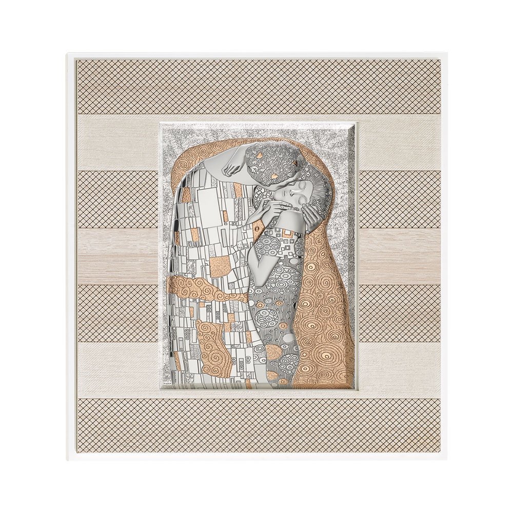 QUADRO MODERNO IL BACIO DI KLIMT IN ARGENTO BILAMINATO CON PARTICOLARI IN ORO DA APPOGGIO E DA PARETE