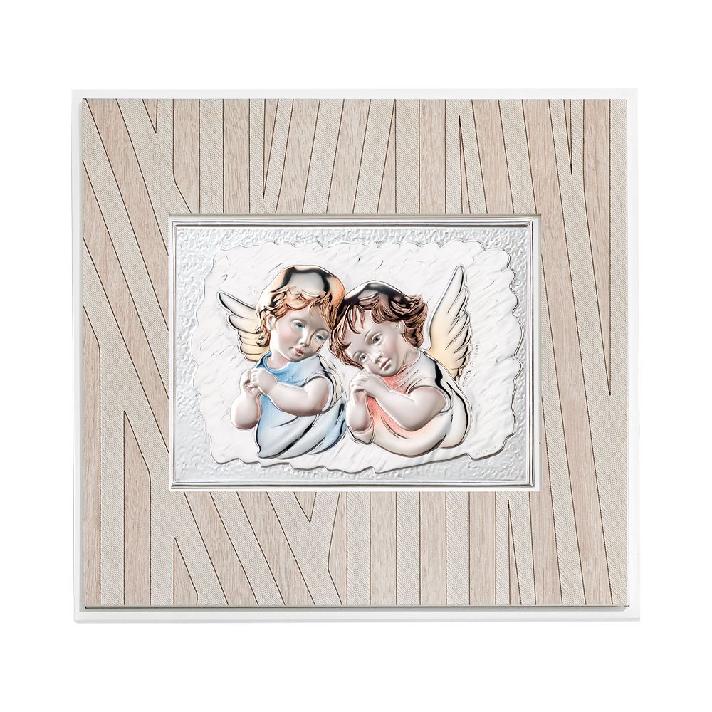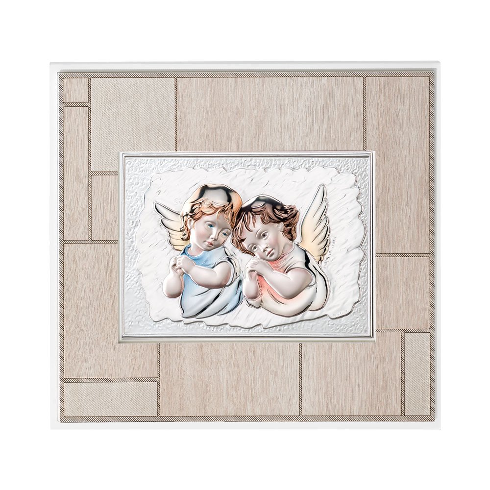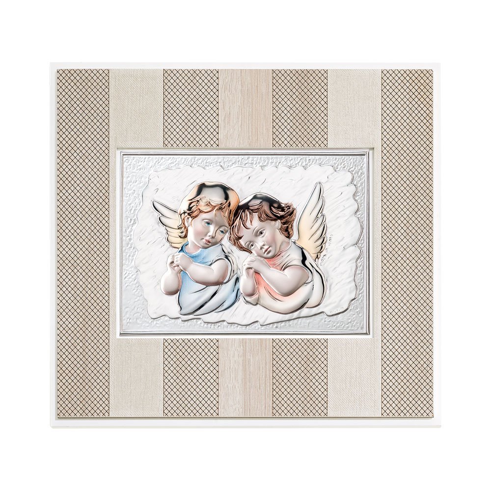 QUADRO MODERNO CON ANGELI COLORATI IN ARGENTO PVD DA APPOGGIO E DA PARETE