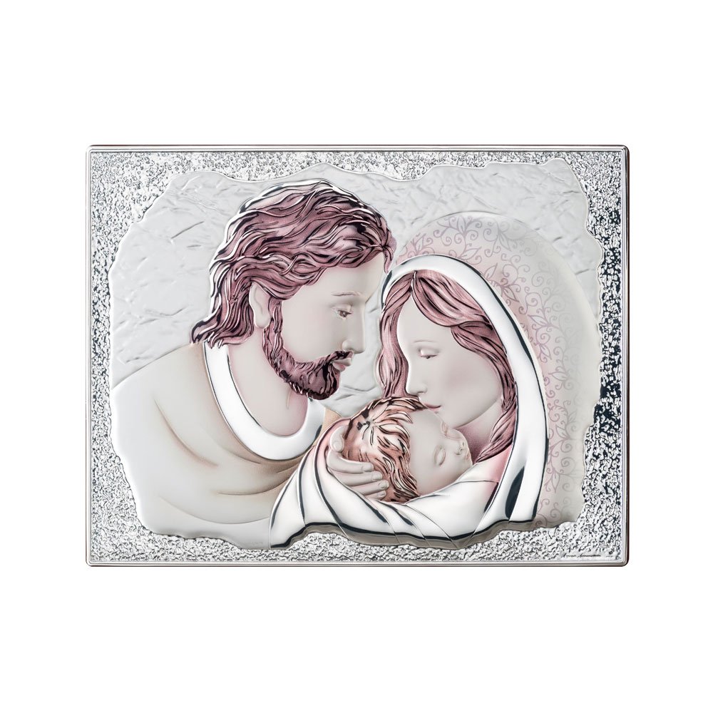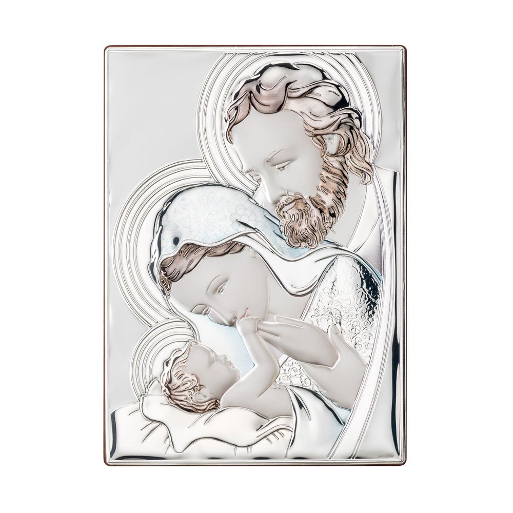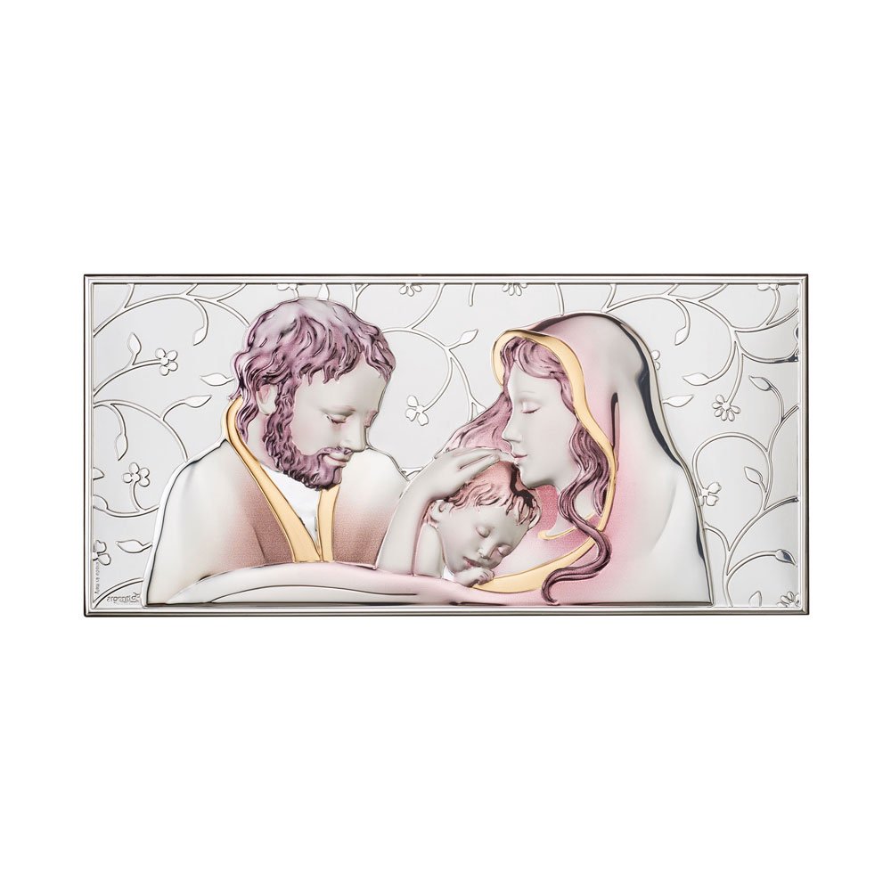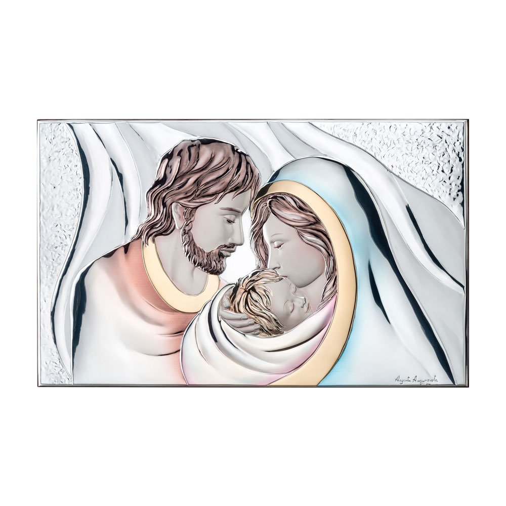 ICONA SACRA FAMIGLIA COLORATA REALIZZATA IN ARGENTO PVD RETRO LEGNO DA PARETE E DA APPOGGIO