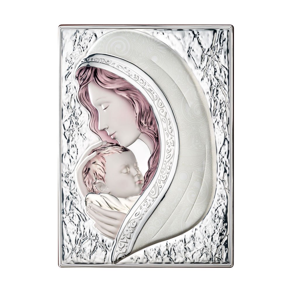 SET PORTAFOTO ROSA 9X13 BIMBI E CAPOCULLA ROSA 6X6 CM CON IMMAGINE DELLA MADONNA IN ARGENTO PVD