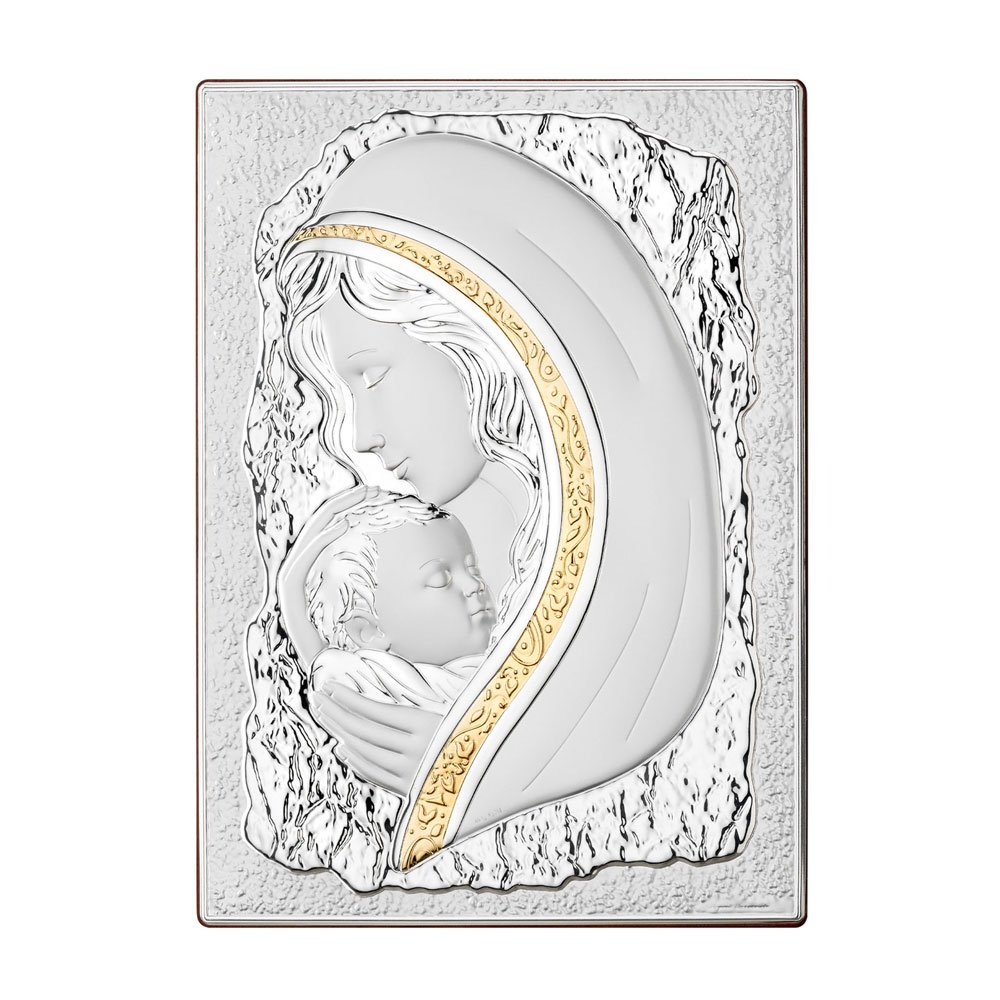 ICONA MADONNA IN ARGENTO PVD CON PARTICOLARI IN ORO RETRO LEGNO DA PARETE E DA APPOGGIO