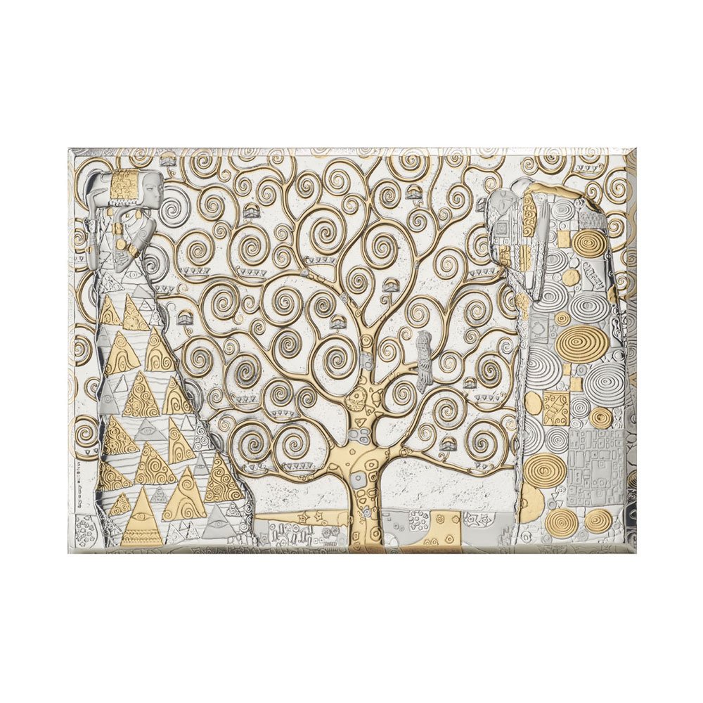 ALBERO DELLA VITA DI KLIMT IN ARGENTO BILAMINATO CON PARICOLARI IN ORO MISURA 33X24 CM. RETRO LEGNO DA PARETE E DA APPOGGIO