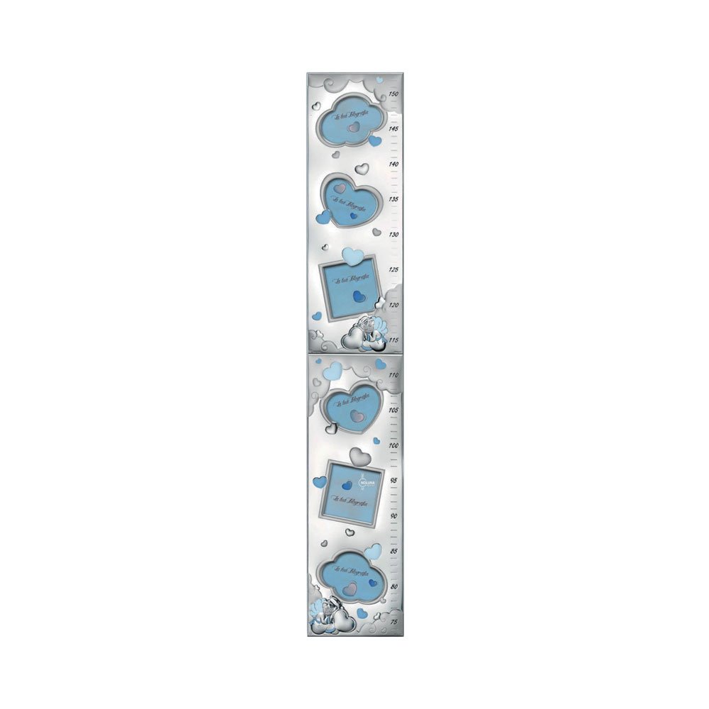 METRO DA PARETE PER BIMBO 14X80 CM CON PORTAFOTO INTERNI COLORATO CELESTE IN ARGENTO PVD RETRO LEGNO