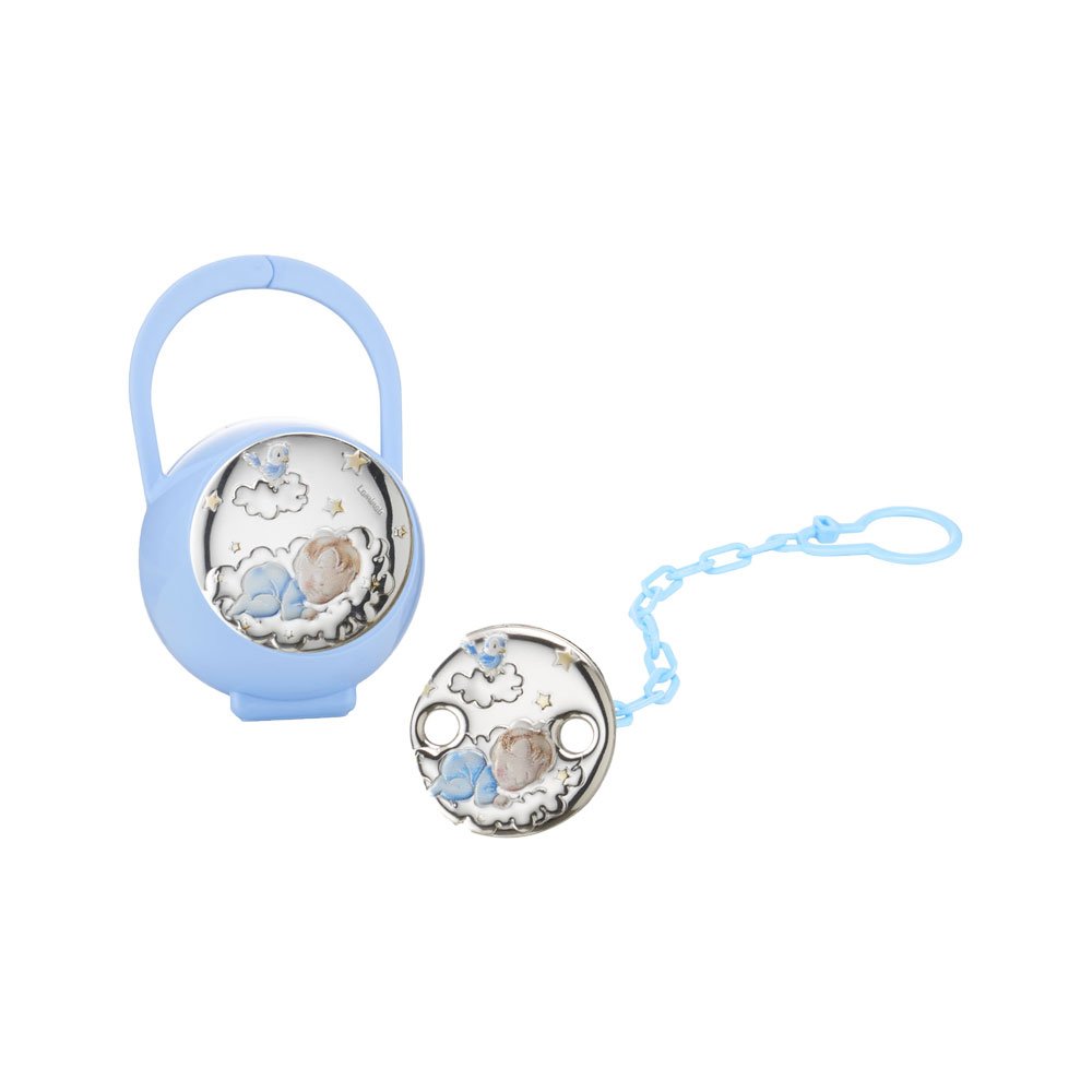 SET CIUCCIO BIMBO BOX CIUCCIO E CATENINA CON PLACCA BIMBO COLORATA CELESTE IN ARGENTO PVD