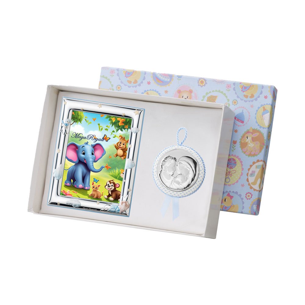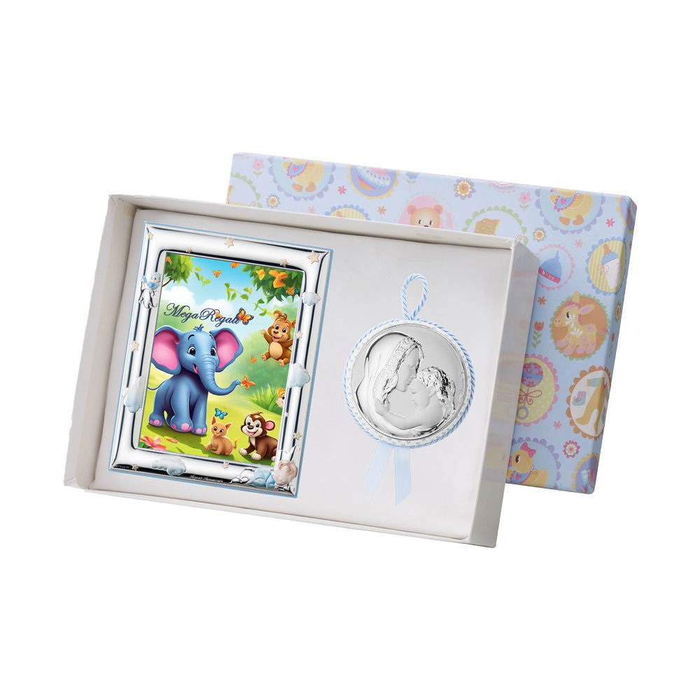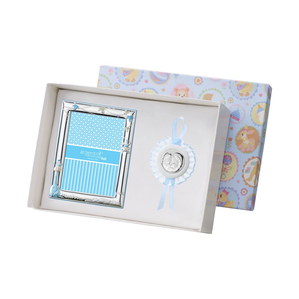 SET PORTAFOTO CELESTE 9X13 GIRAFFA E CAPOCULLA CELESTE 6X6 CM CON IMMAGGINE DELLA MADONNA IN ARGENTO PVD