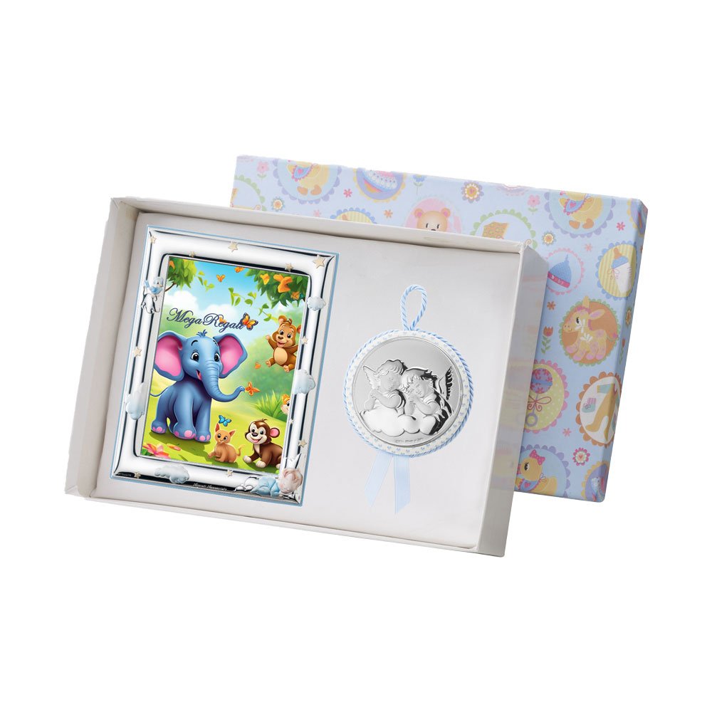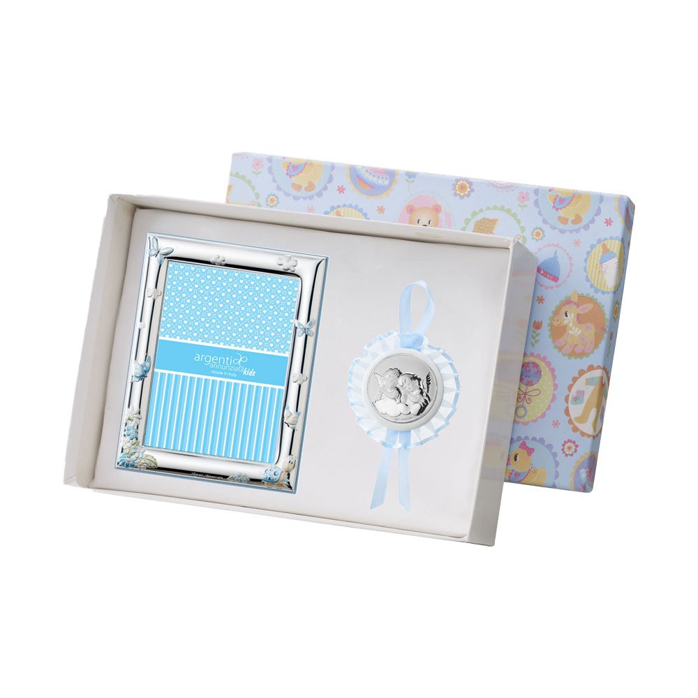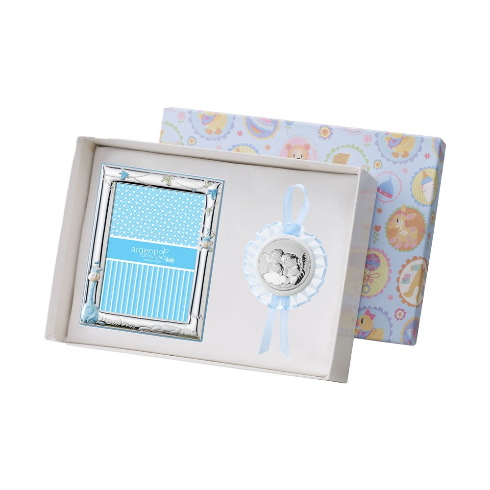 SET PORTAFOTO CELESTE 9X13 GIRAFFA E CAPOCULLA CELESTE 6X6 CM CON IMMAGINE DEGLIA ANGELI IN ARGENTO PVD