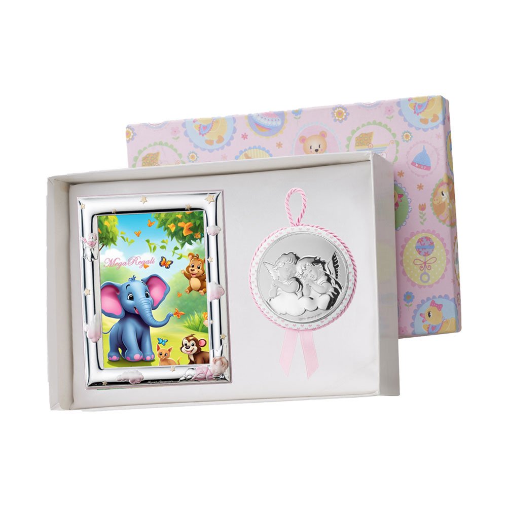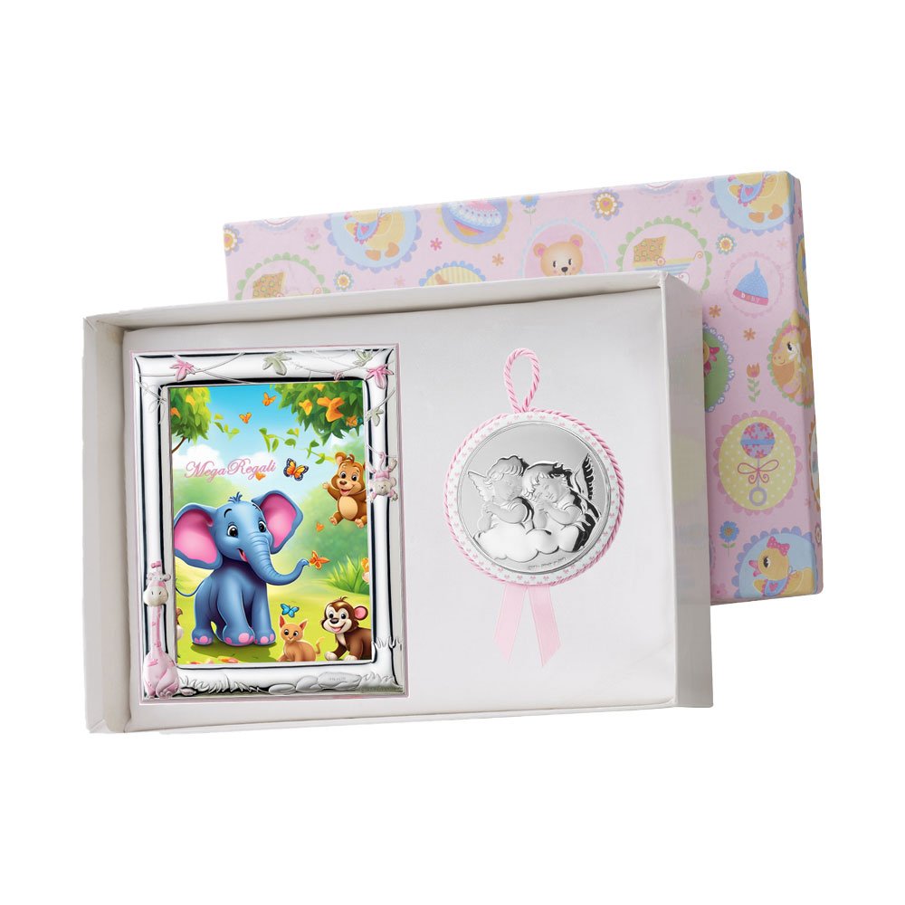 SET PORTAFOTO ROSA 9X13 GIRAFFA E CAPOCULLA ROSA 6X6 CM CON IMMAGINE DEGLI ANGELI IN ARGENTO PVD