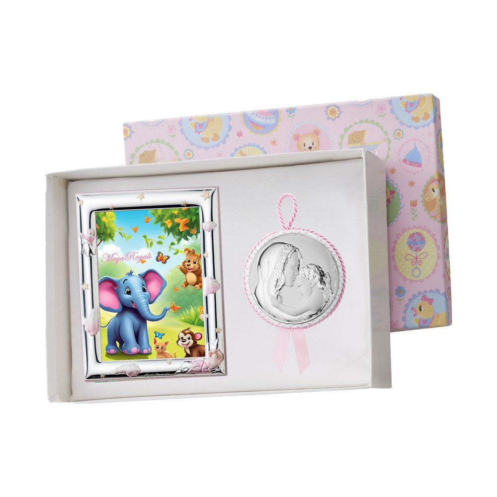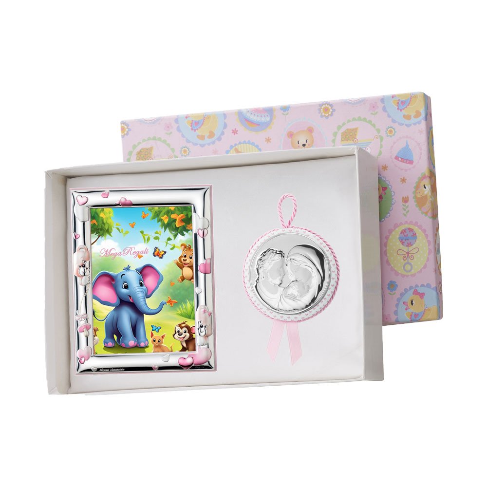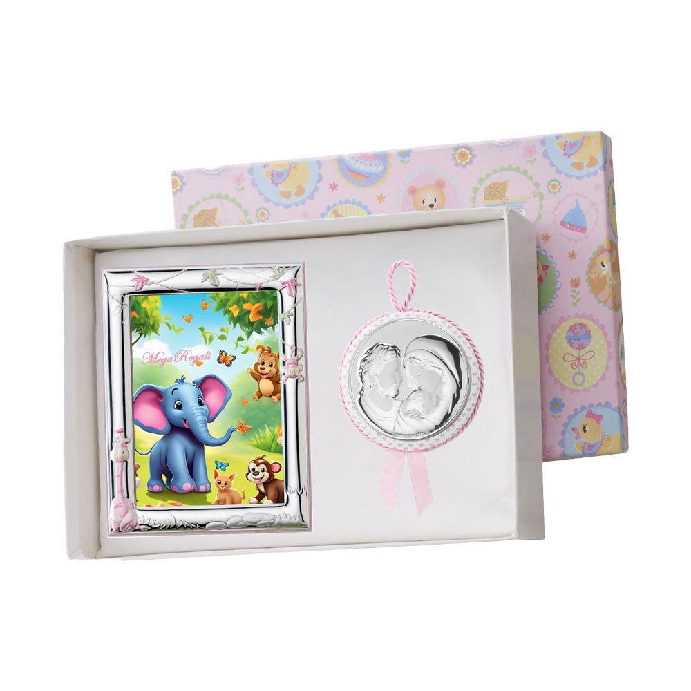 SET PORTAFOTO ROSA 9X13 GIRAFFA E CAPOCULLA ROSA 6X6 CM CON IMMAGINE DELLA MADONNA IN ARGENTO PVD