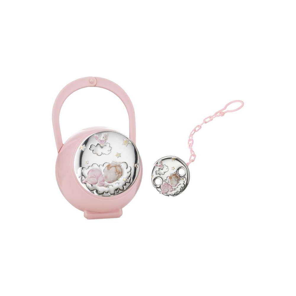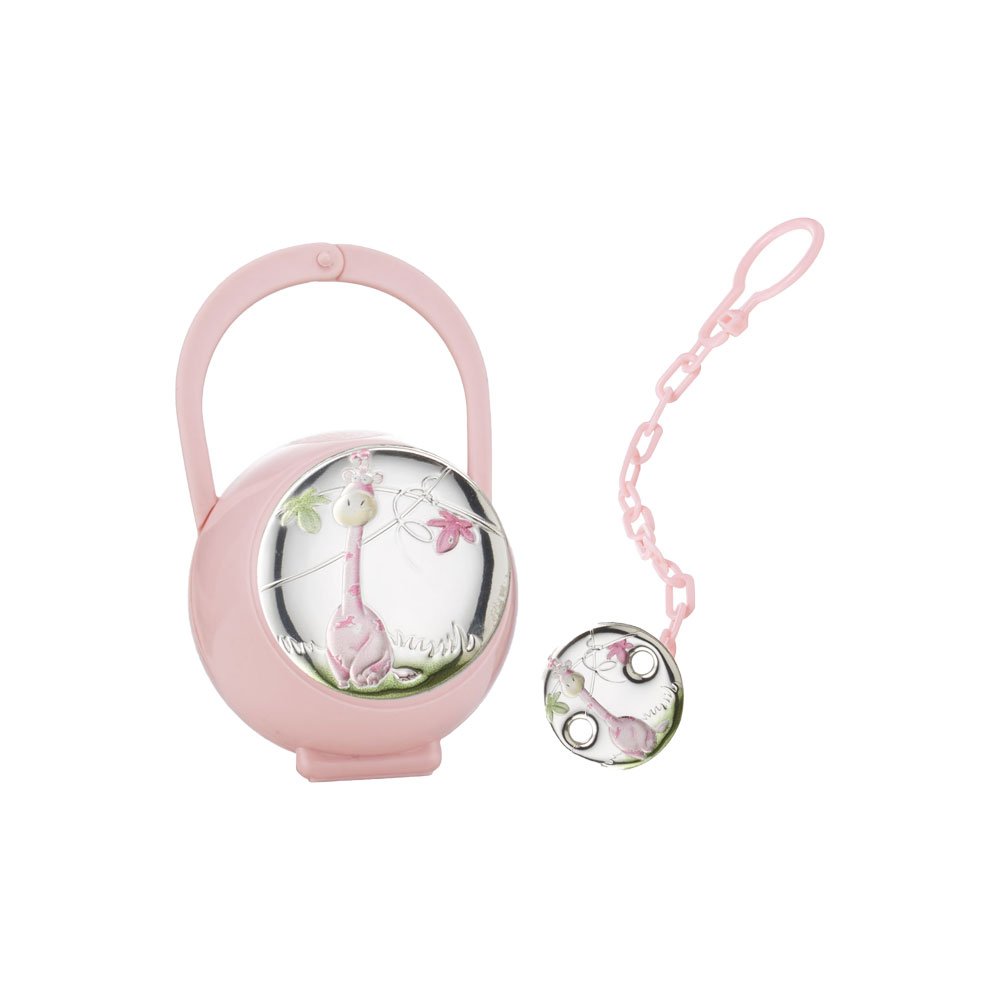 SET CIUCCIO BIMBA BOX CIUCCIO E CATENINA CON PLACCA GIRAFFA COLORATA ROSA IN ARGENTO PVD