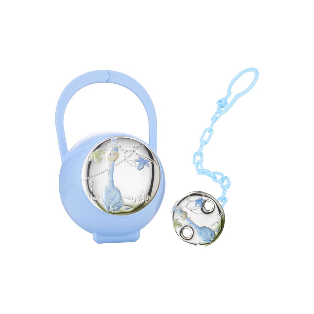 SET CIUCCIO BIMBO BOX CIUCCIO E CATENINA CON PLACCA GIRAFFA COLORATA CELESTE IN ARGENTO PVD