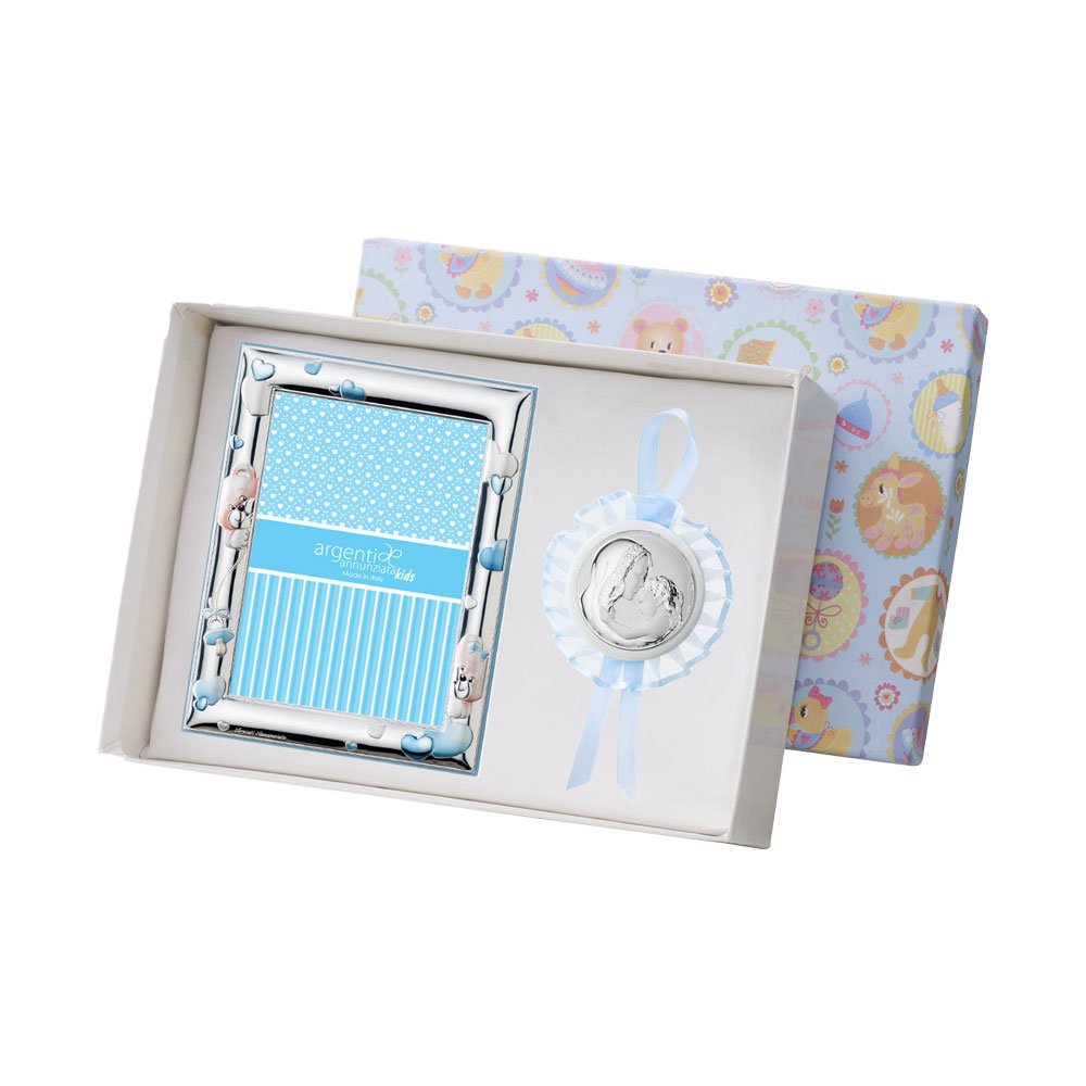 SET PORTAFOTO CELESTE 9X13 ORSETTI E CAPOCULLA CELESTE 6X6 CM CON IMMAGINE DELLA MADONNA IN ARGENTO PVD
