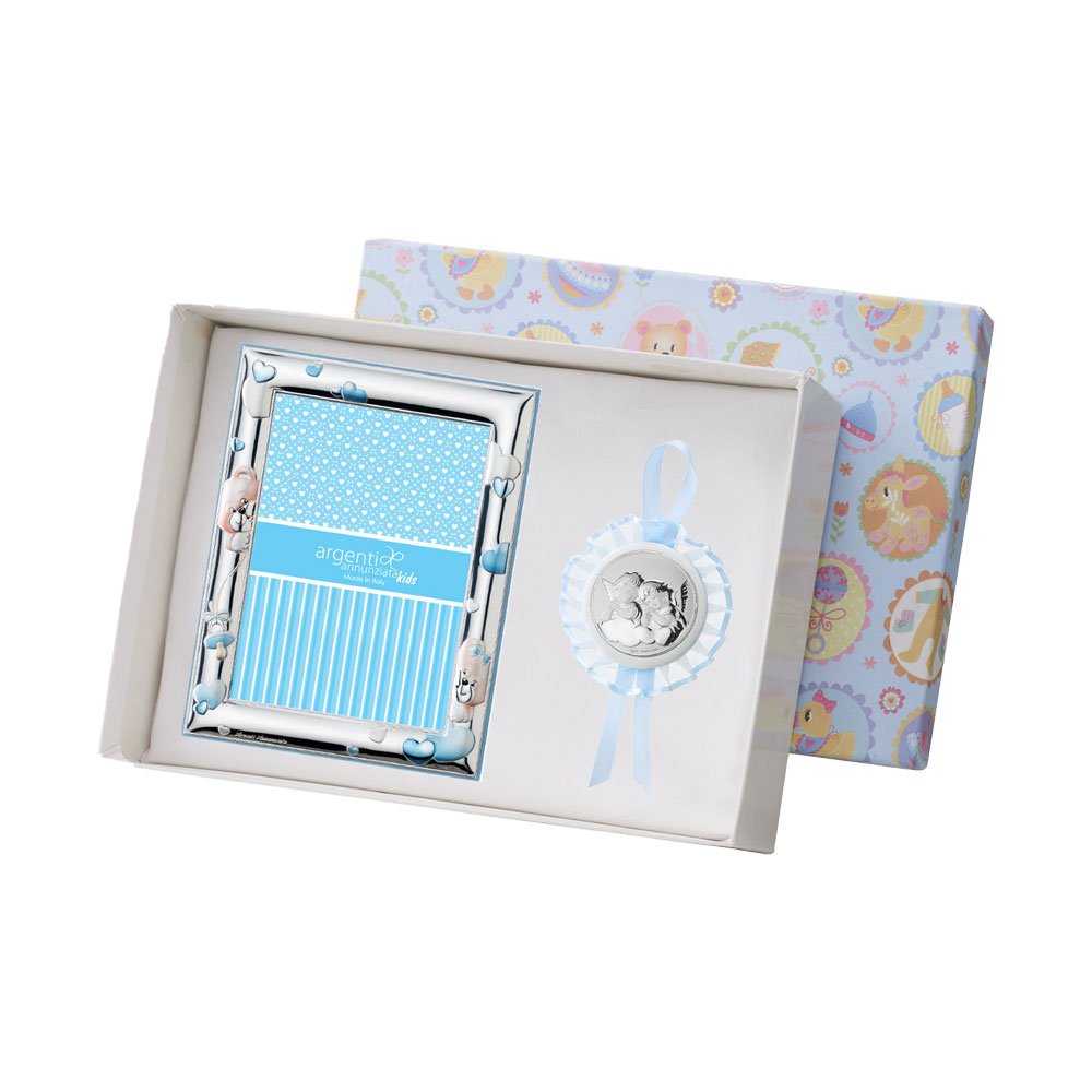 SET PORTAFOTO CELESTE 9X13 ORSETTI E CAPOCULLA CELESTE 6X6 CM CON IMMAGINE DEGLI ANGELI IN ARGENTO PVD
