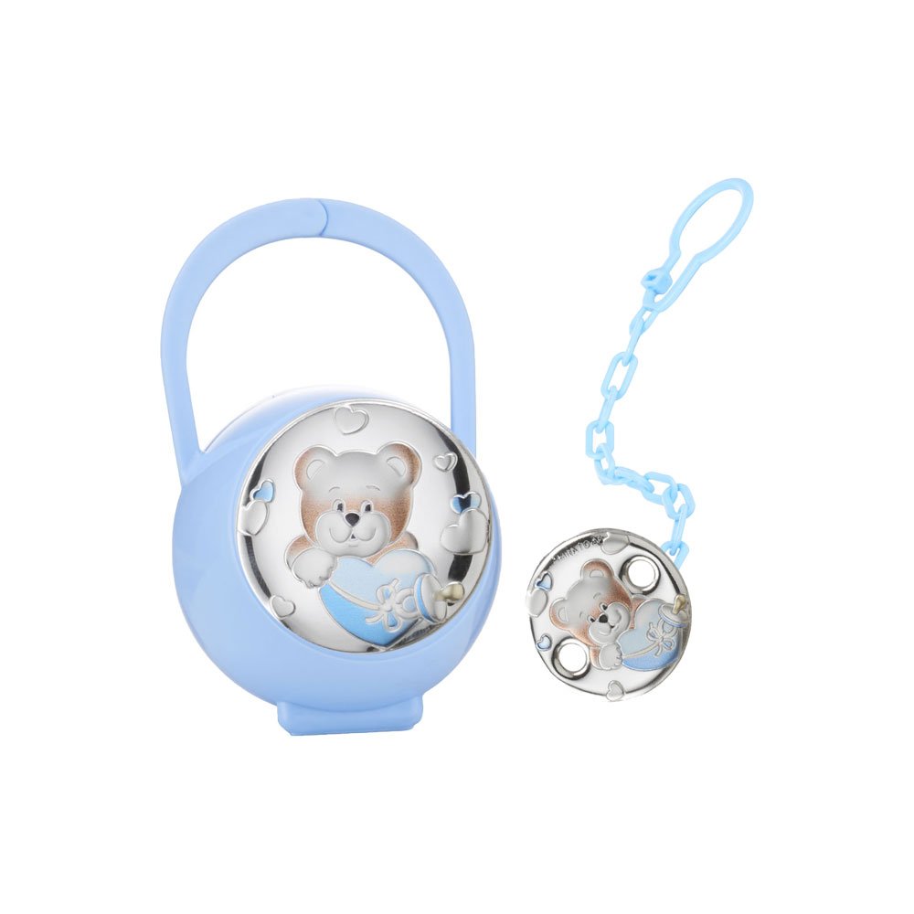 SET CIUCCIO BIMBO BOX CIUCCIO E CATENINA CON PLACCA ORSETTO COLORATA CELESTE IN ARGENTO PVD