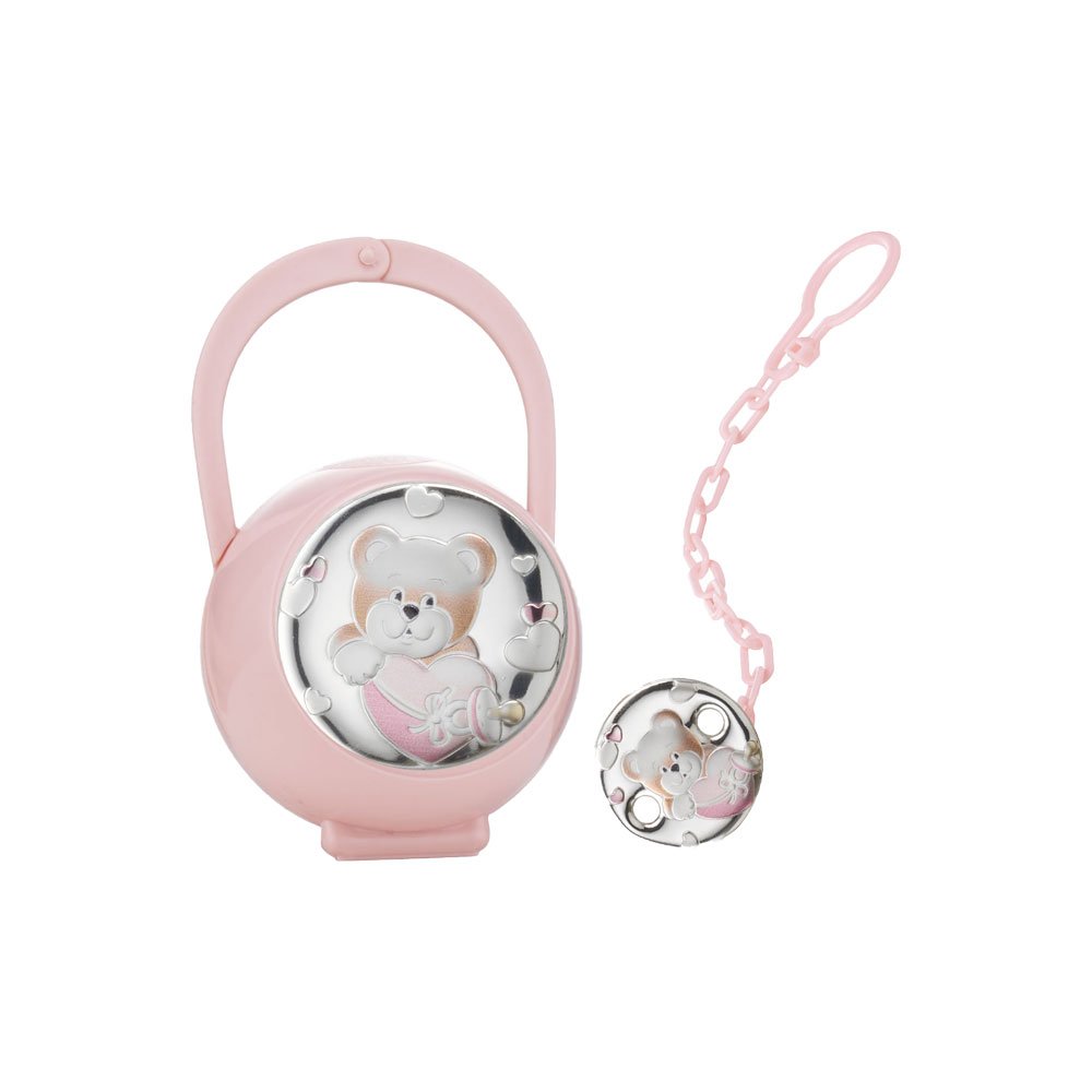 SET CIUCCIO BIMBA BOX CIUCCIO E CATENINA CON PLACCA ORSETTO COLORATA ROSA IN ARGENTO PVD