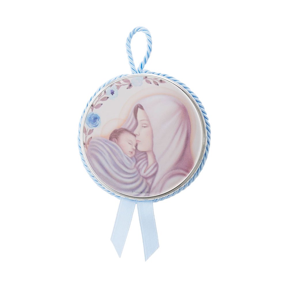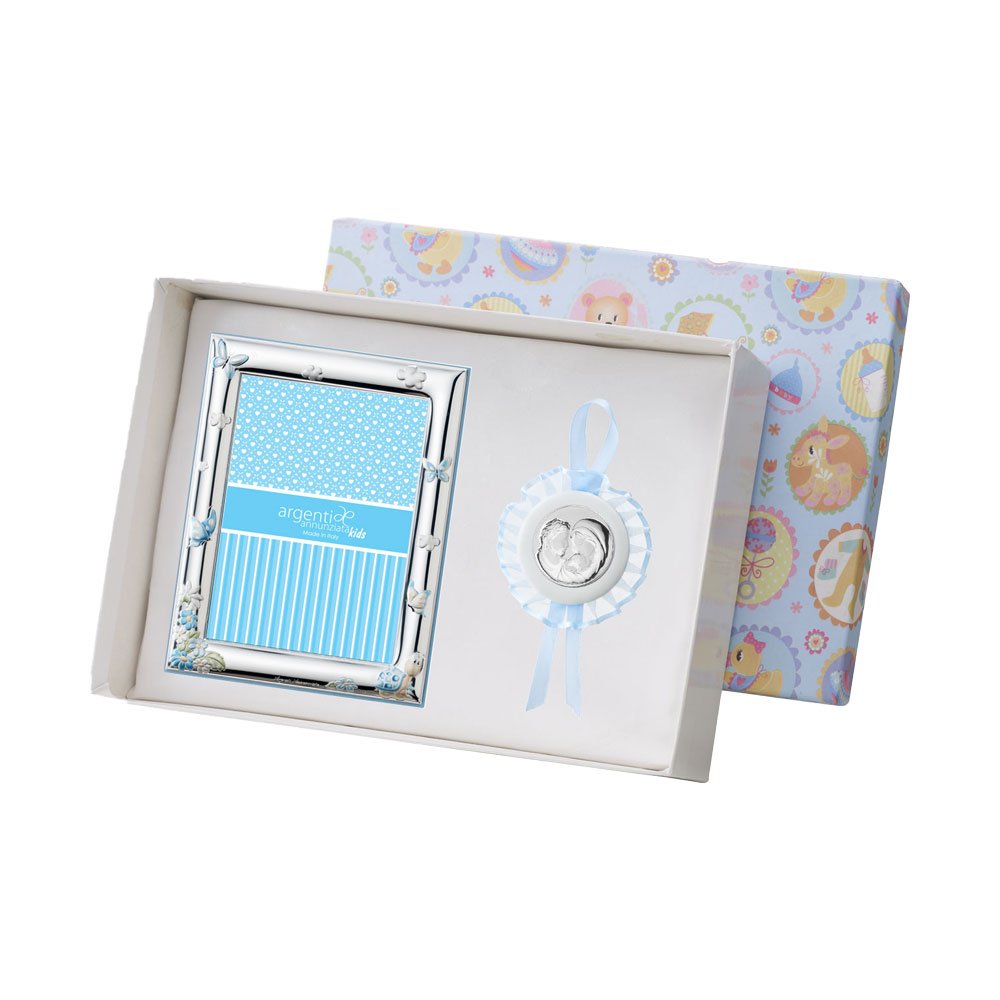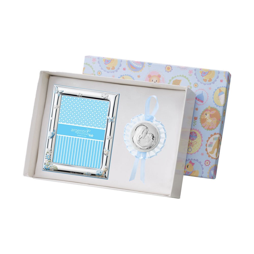 SET PORTAFOTO CELESTE 9X13 BIMBI E CAPOCULLA CELESTE 6X6 CM CON IMMAGINE DELLA MADONNA IN ARGENTO PVD