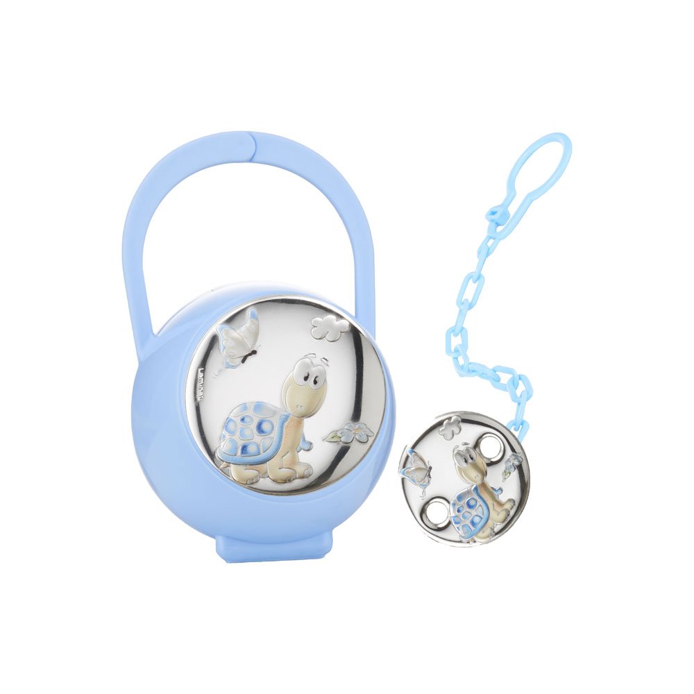 SET CIUCCIO BIMBO BOX CIUCCIO E CATENINA CON PLACCA TARTARUGA COLORATA CELESTE IN ARGENTO PVD