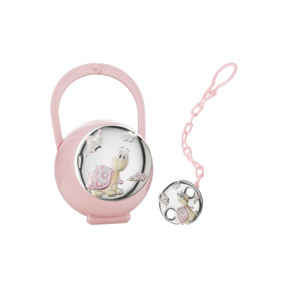 SET CIUCCIO BIMBA BOX CIUCCIO E CATENINA CON PLACCA TARTARUGA COLORATA ROSA IN ARGENTO PVD