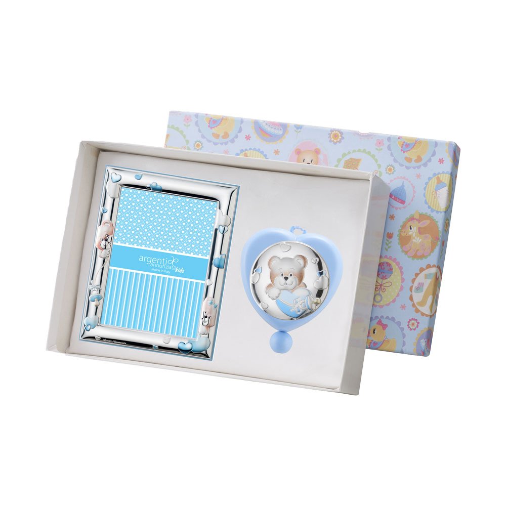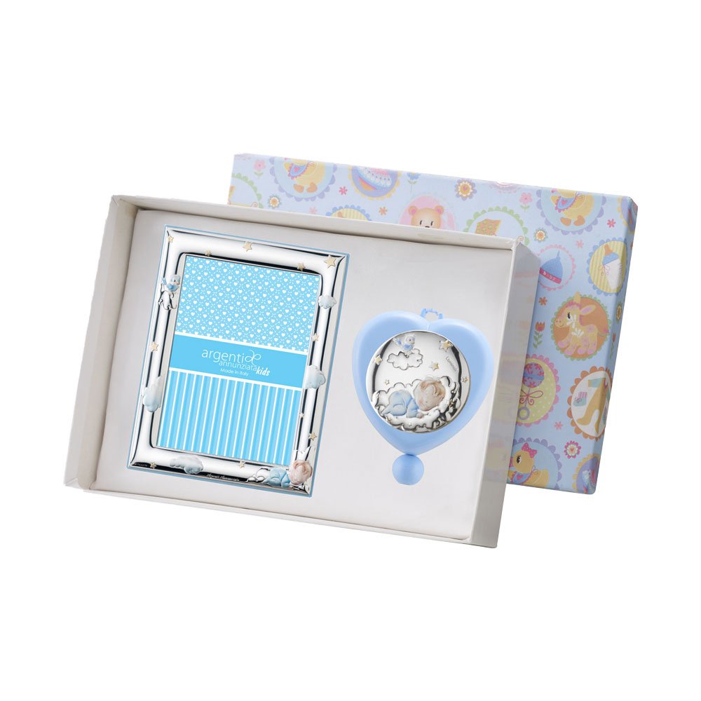 SET PORTAFOTO CELESTE 9X13 E CARILLON CUORE CELESTE 6X6 CM CON BIMBI IN ARGENTO PVD