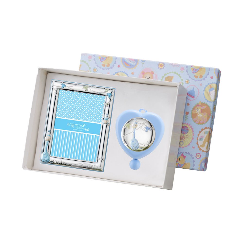 SET PORTAFOTO CELESTE 9X13 E CARILLON CUORE CELESTE 6X6 CM CON GIRAFFA IN ARGENTO PVD