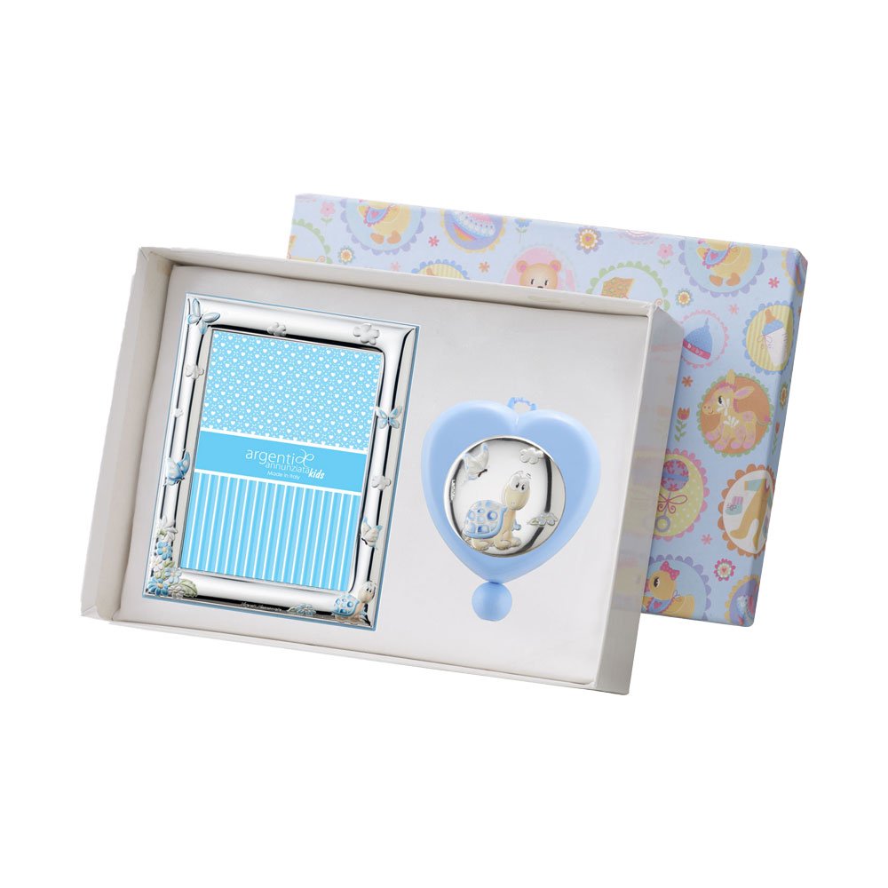 SET PORTAFOTO CELESTE 9X13 E CARILLON CUORE CELESTE 6X6 CM CON TARTARUGA IN ARGENTO PVD
