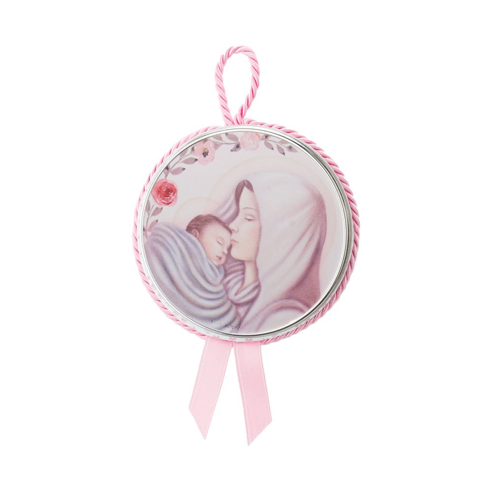 MEDAGLIONE CAPOCULLA 6X6 CM CON IMMAGINE DELLA MADONNA COLORATA IN ARGENTO PVD PELLE ROSA CON CARILLON MUSICALE