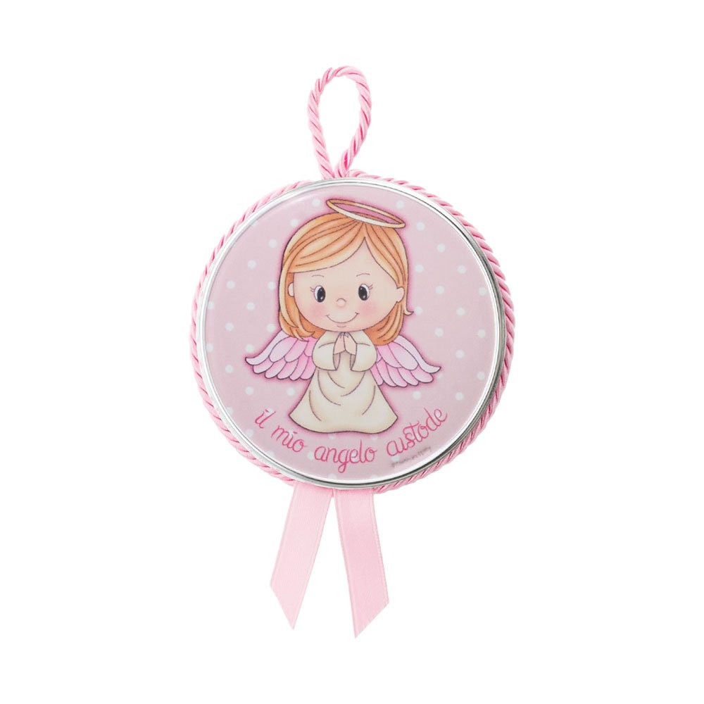 MEDAGLIONE CAPOCULLA 6X6 CM CON IMMAGINE DEL MIO ANGELO CUSTODE COLORATO IN ARGENTO PVD PELLE ROSA CON CARILLON MUSICALE